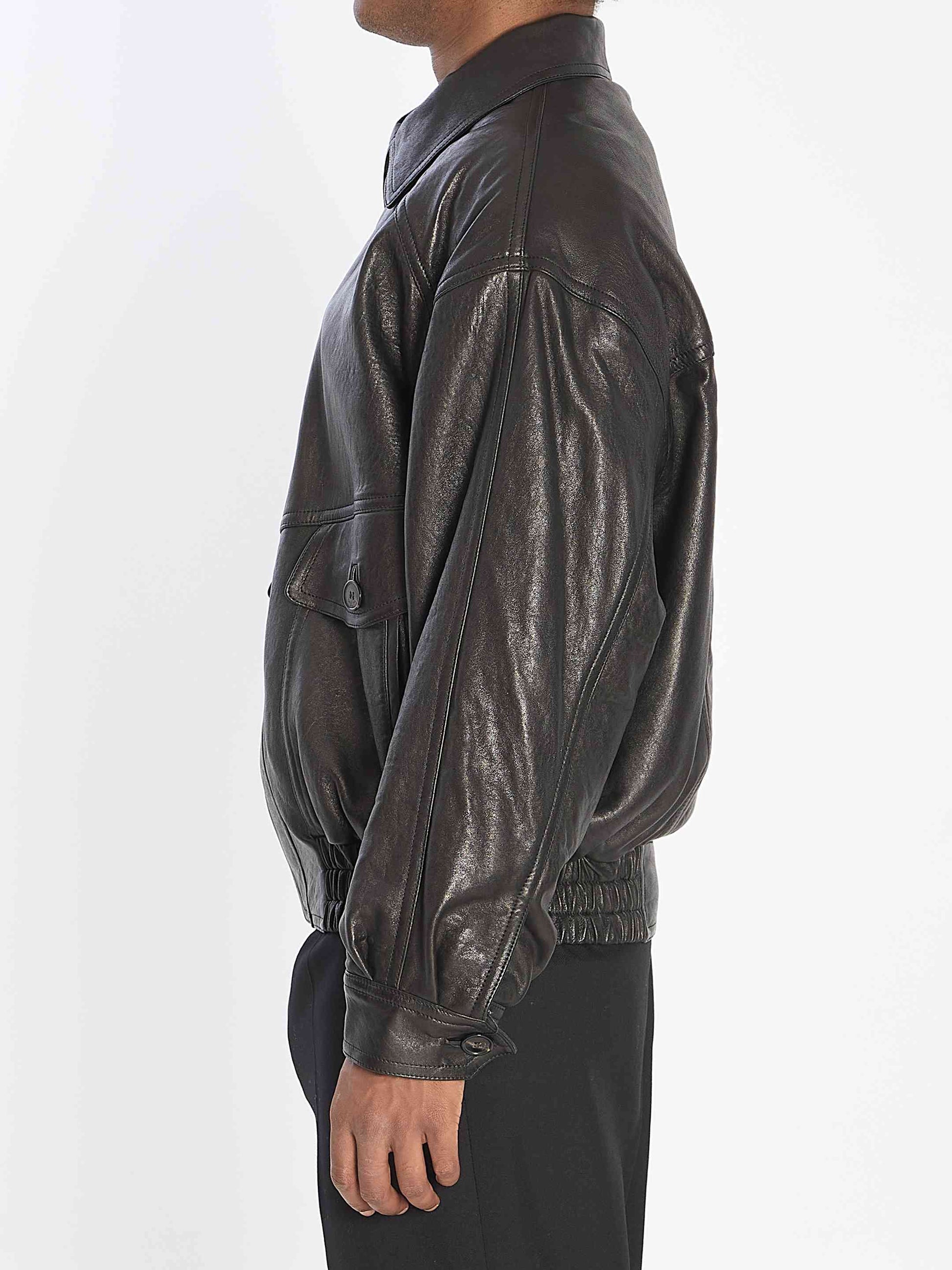 Bomber jacket in genuine black lambskin leather. Featuring a pointed collar, zip closure with snap buttons and wind flap, two vertical flap pockets with buttons on the front, two welt pockets, one internal welt pocket, buttoned cuffs, padded shoulders, and gathered waist. Balloon silhouette with a slightly oversized fit.