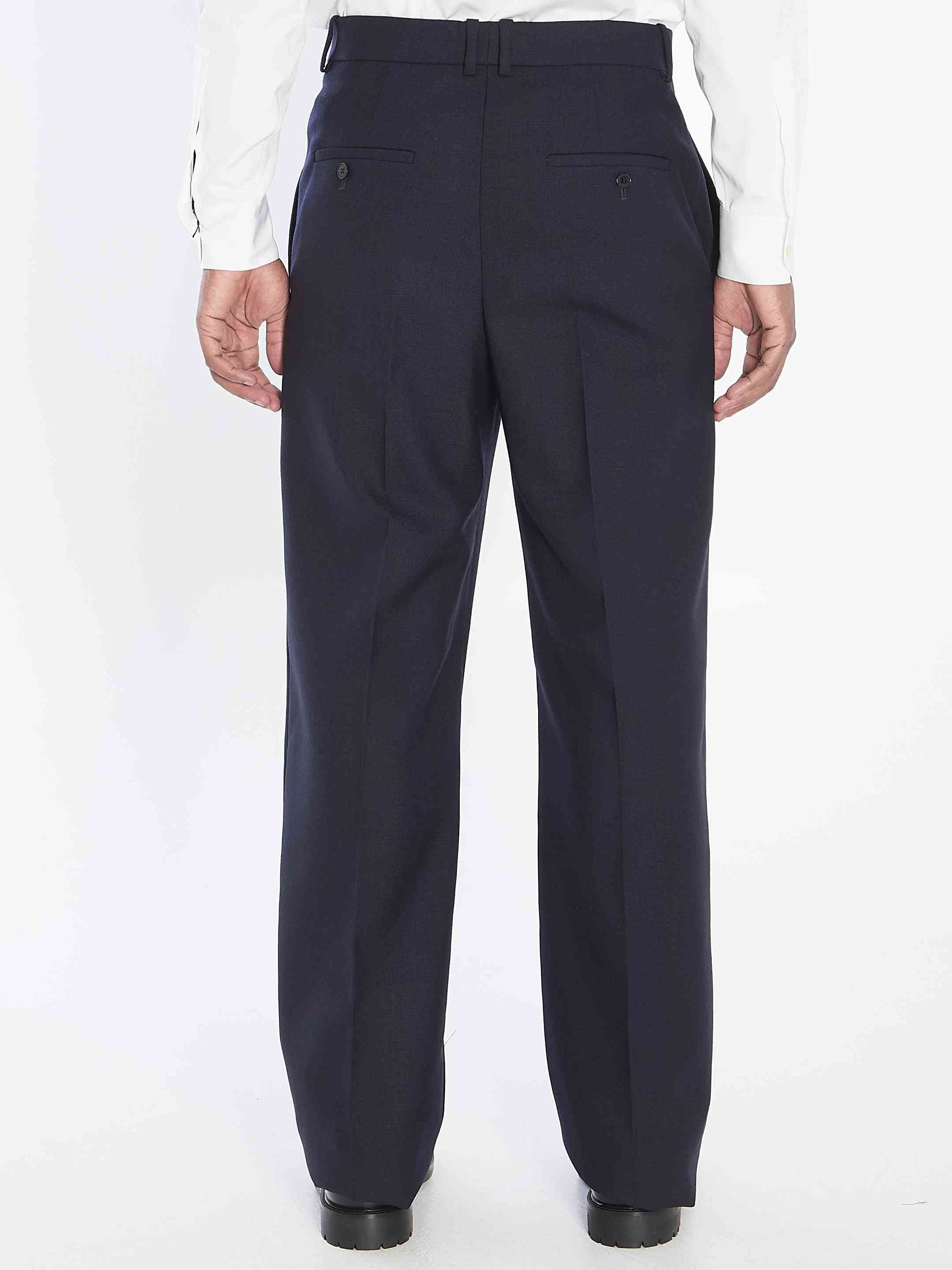 Suit trousers in "marine" blue wool. Features a low-rise waist, double pleats, concealed button, hook and zip closure, two slanted front pockets, two welt back pockets, and belt loops at the waist. Wide-leg fit.