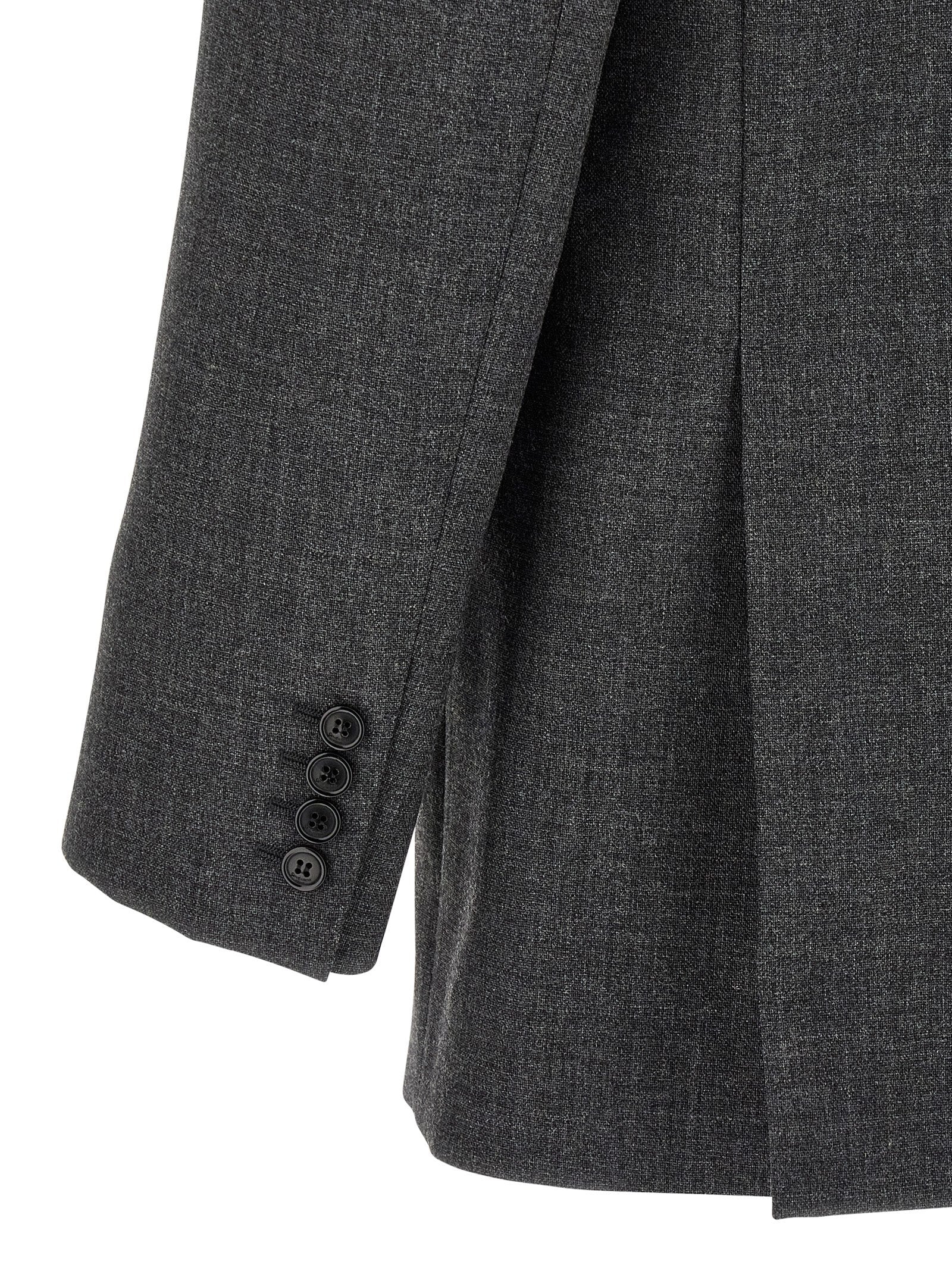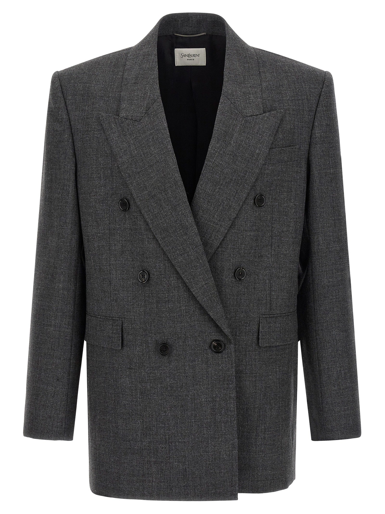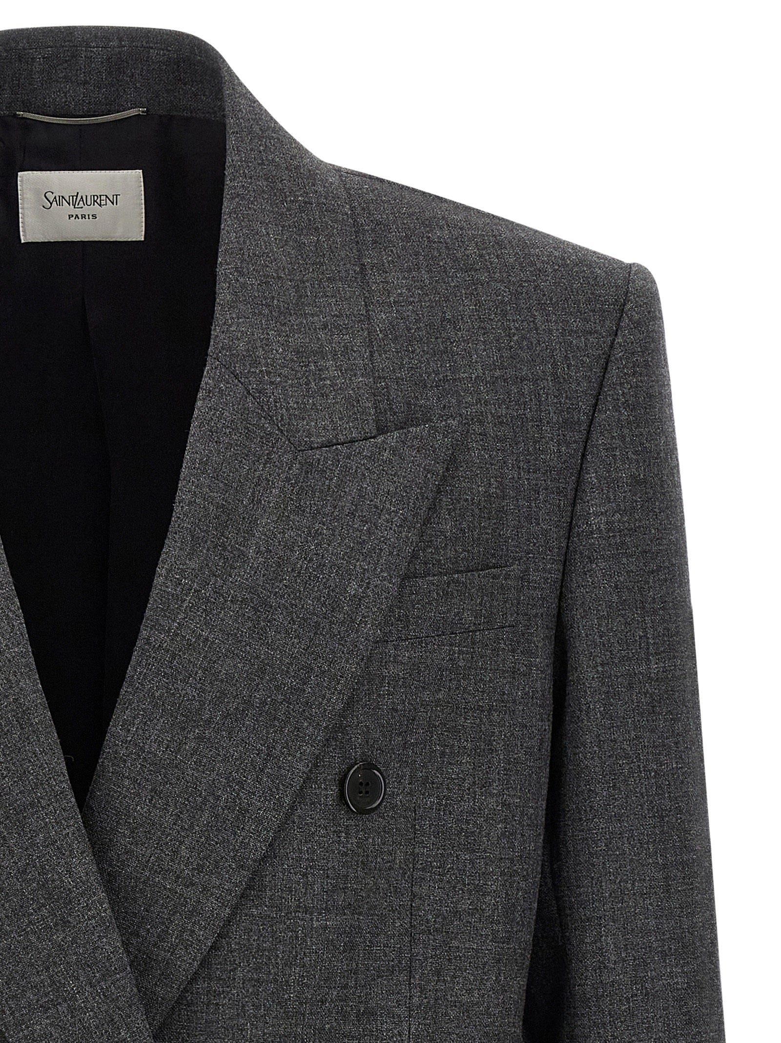 Double-breasted mélange wool blazer with front button closure, peak lapels, chest pocket, flap pockets, two inner pockets, padded shoulders, buttonhole cuffs, back vents, silk lining.