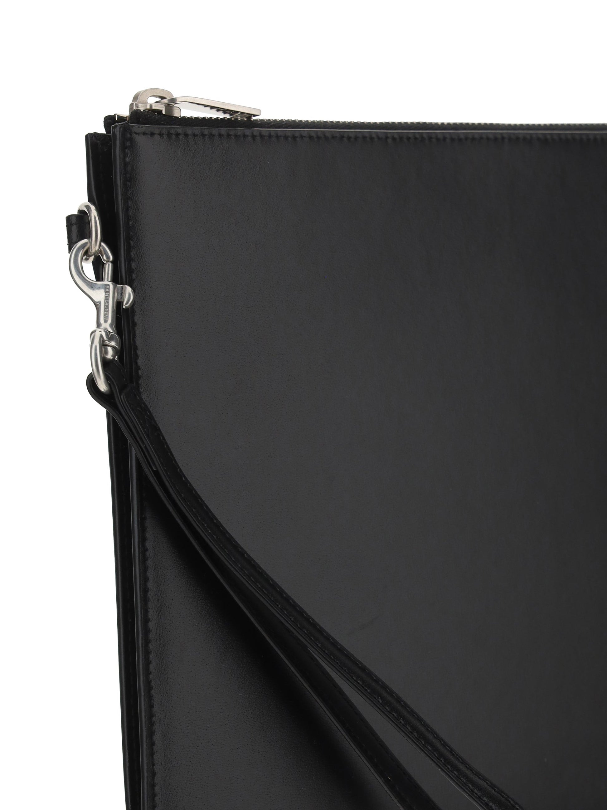 Leather iPad Holder by Saint Laurent, top zipper closure, internal card slot with brand logo inside, embossed brand logo on front, removable external strap.