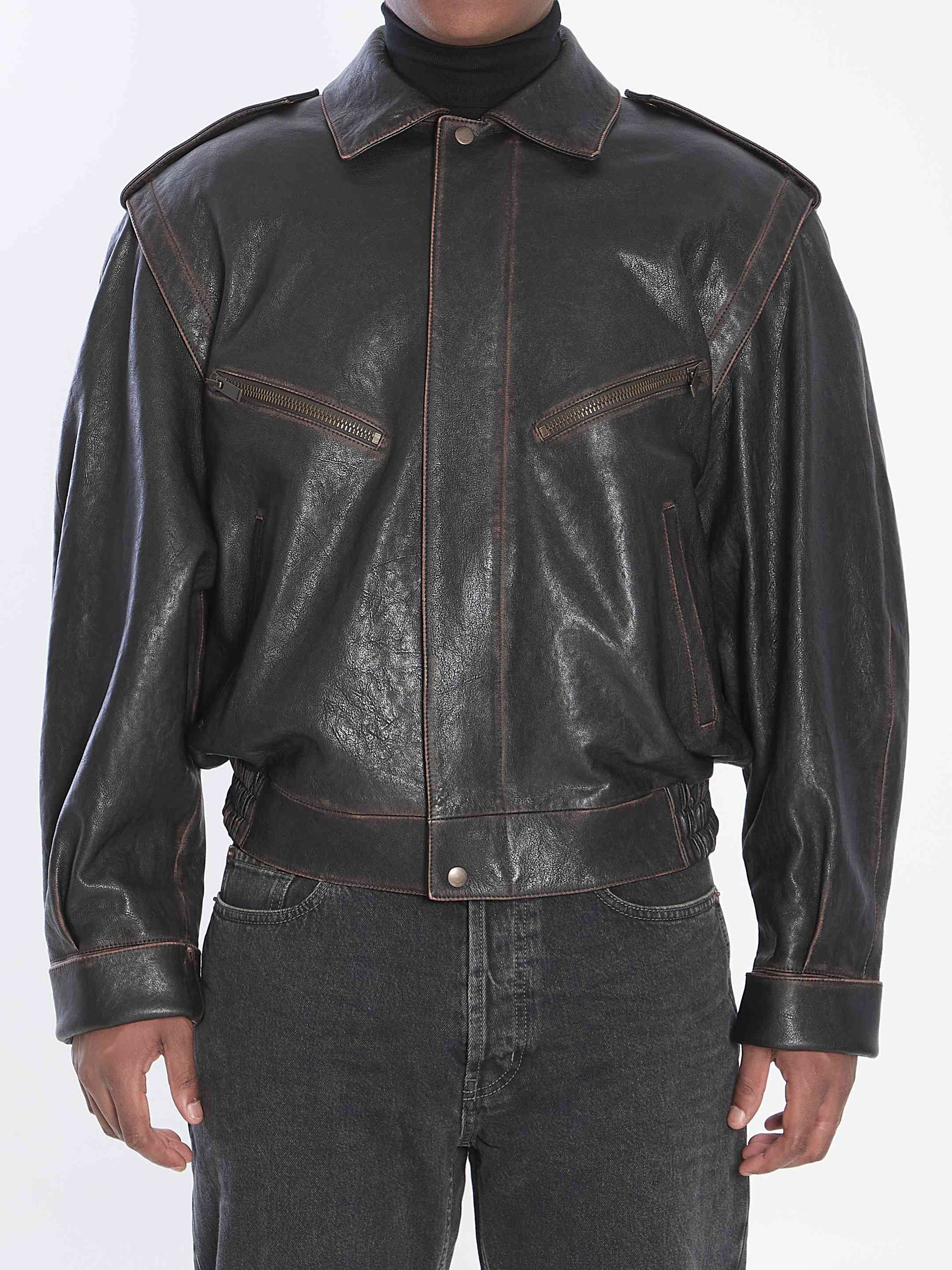 Bomber jacket in finely grained lambskin leather in brown with contrasting finishes. Features a pointed collar, buttoned epaulettes, concealed front zip closure with snap buttons, elasticated hem, two slanted zip pockets and two welt pockets on the front. Slightly oversized fit.