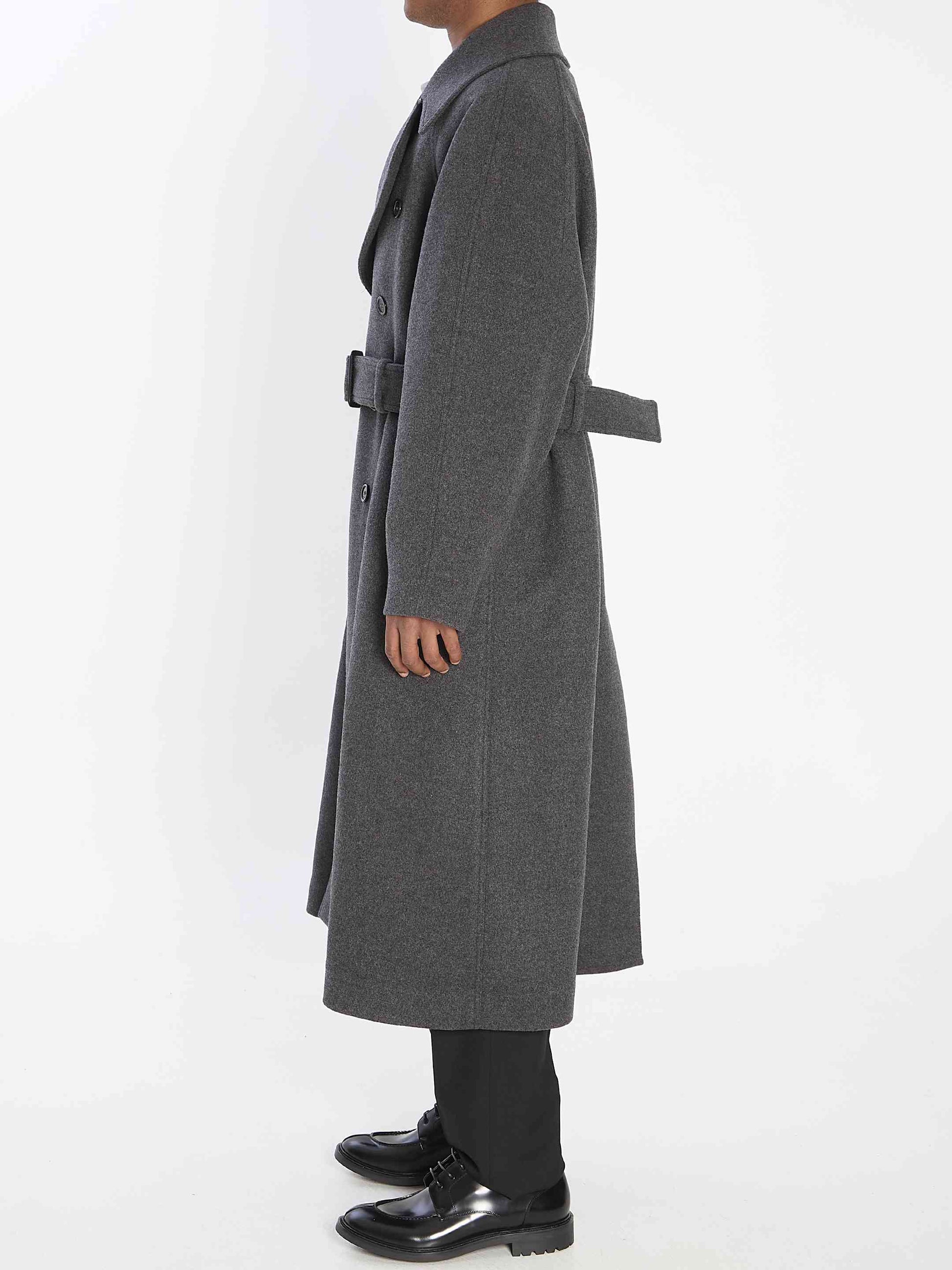 Coat in "Chine" grey cashmere. Featuring a bidirectional Ulster collar, double-breasted closure with eight buttons, raglan sleeves, two welt pockets on the front, a removable and adjustable belt, a center back vent. Classic fit.