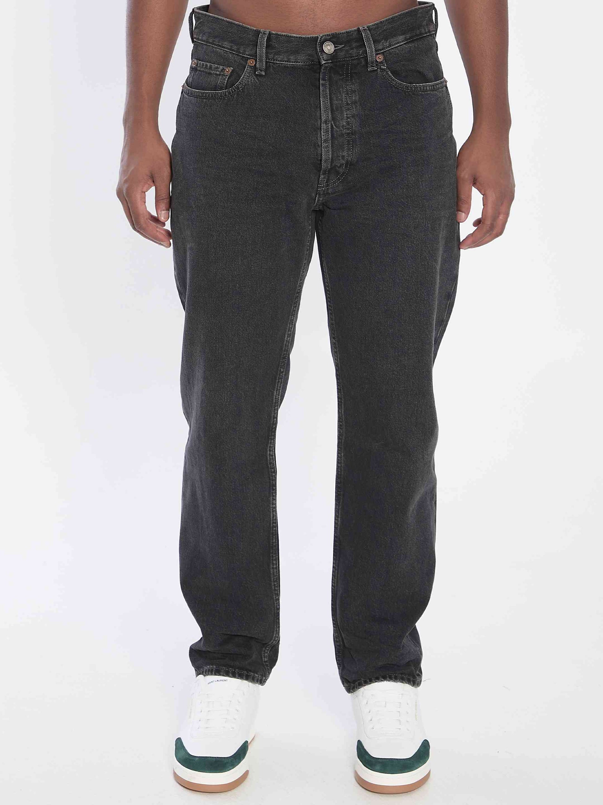 Long jeans in black Westwood denim. Feature button closure, five pockets, belt loops, engraved logo leather patch on the back, mid-rise waist, and straight leg.
