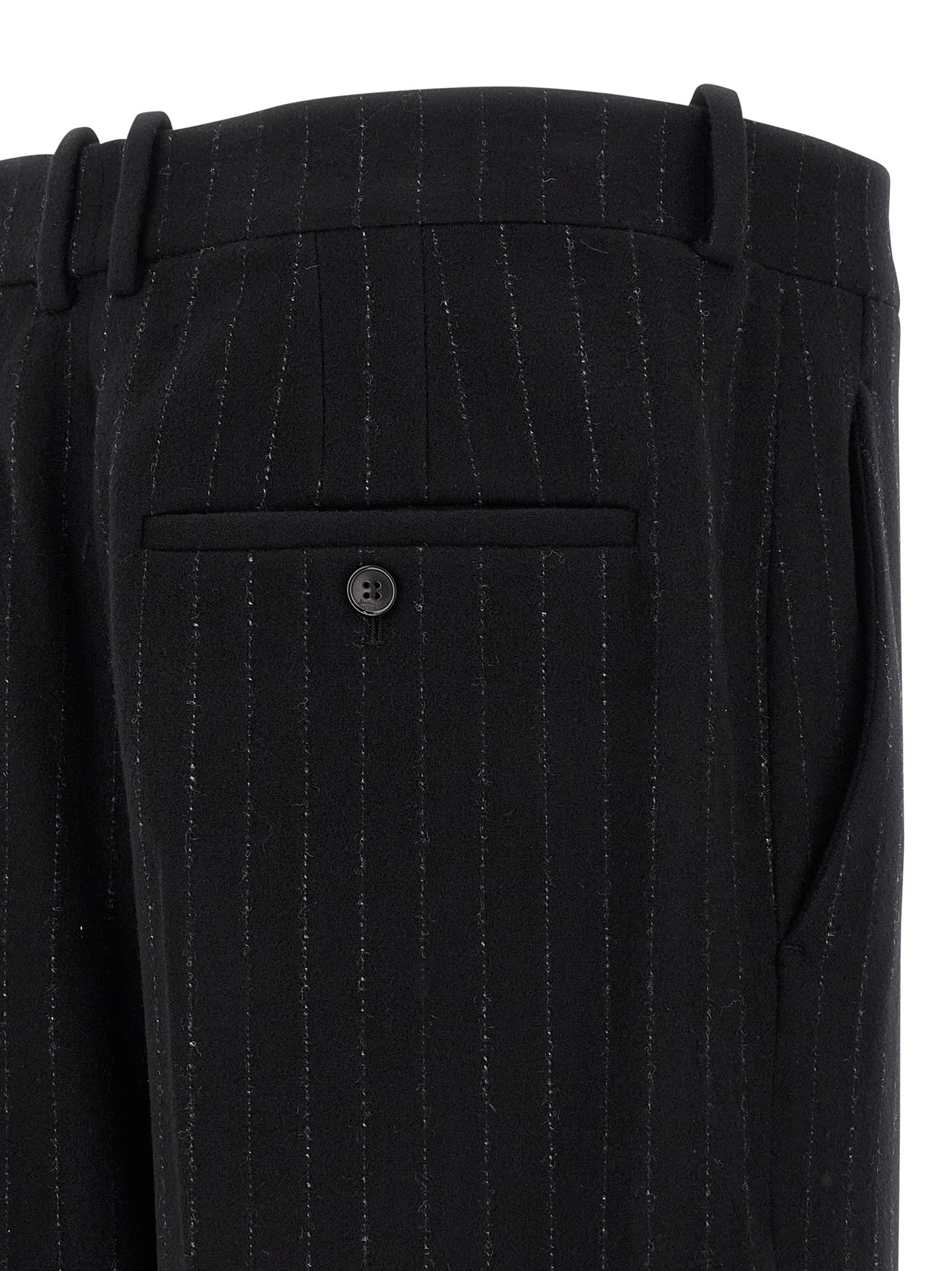 Combed wool pants and pinstripe cashmere flannel trousers, high waist, wide and straight leg, stretched pleat, zip, hook and front button closure, pockets.