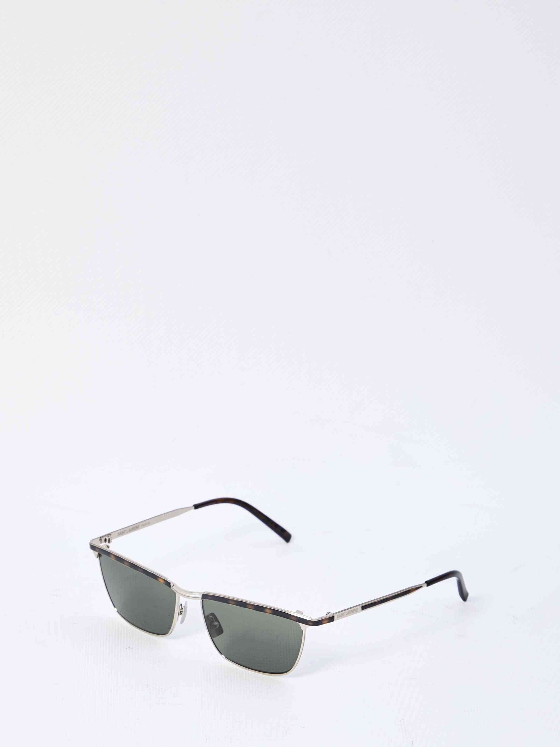 Trapezoidal sunglasses with silver tone metal frame and nylon lenses. Feature a double bridge, top bar with tortoiseshell insert, and Saint Laurent signature engraved on the temples. The frame is compatible with prescription lenses.