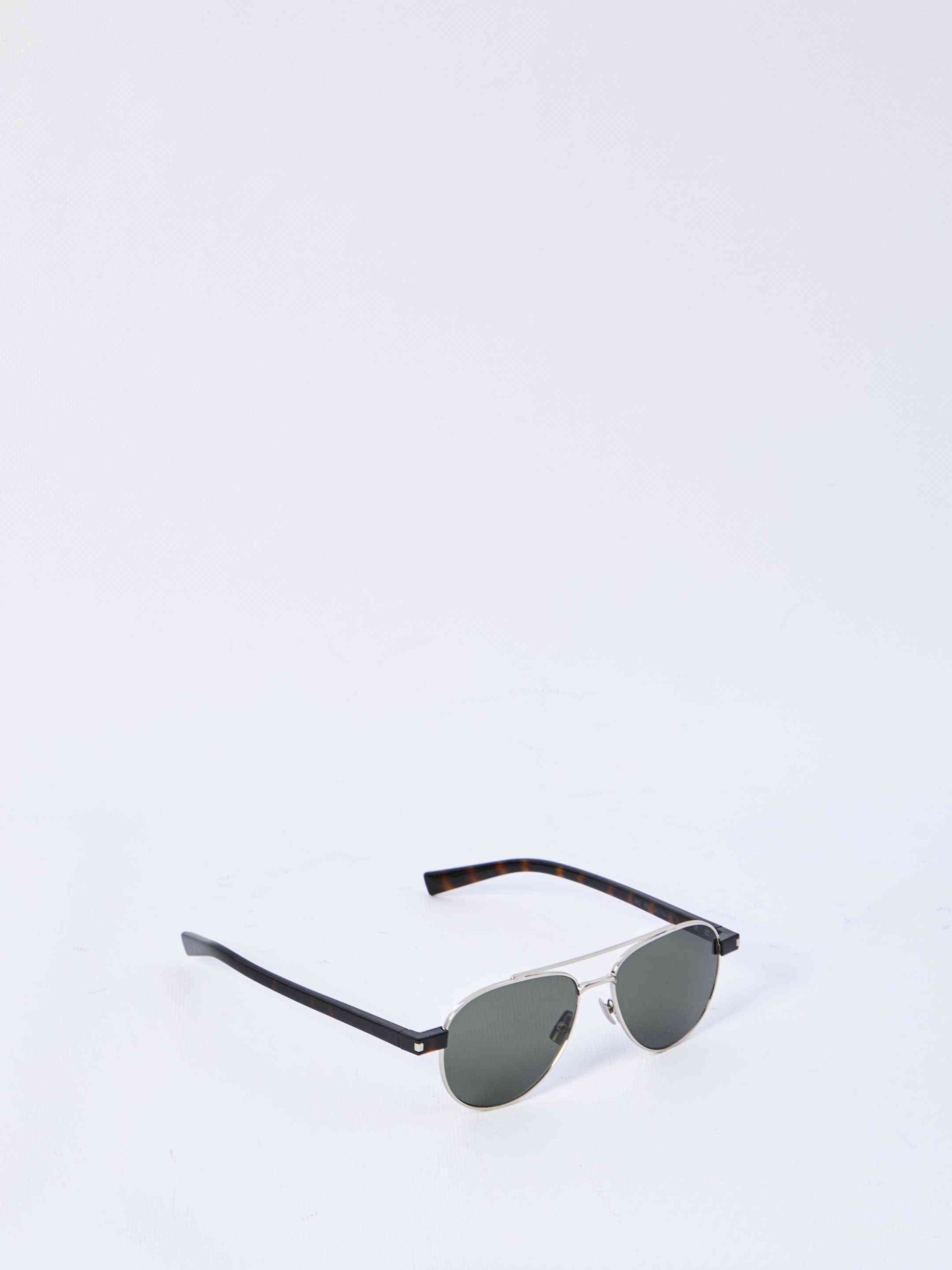 Silver and grey sunglasses. Acetate frame with Havana pattern on the temples, aviator-style lenses.