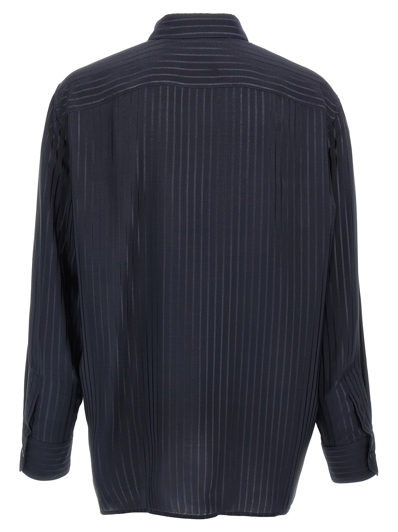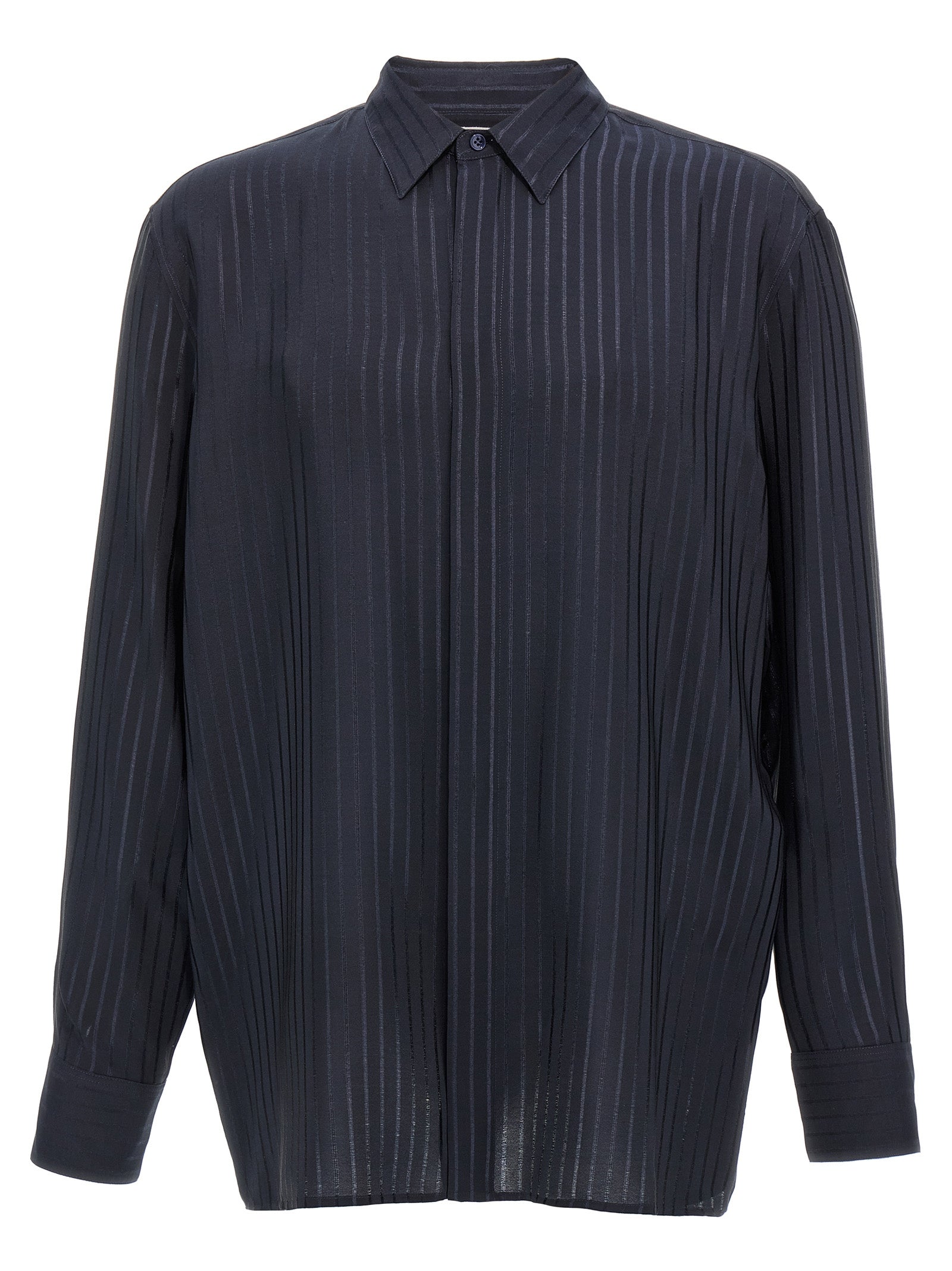 Striped silk shirt, concealed front button closure, long cuffed sleeves.