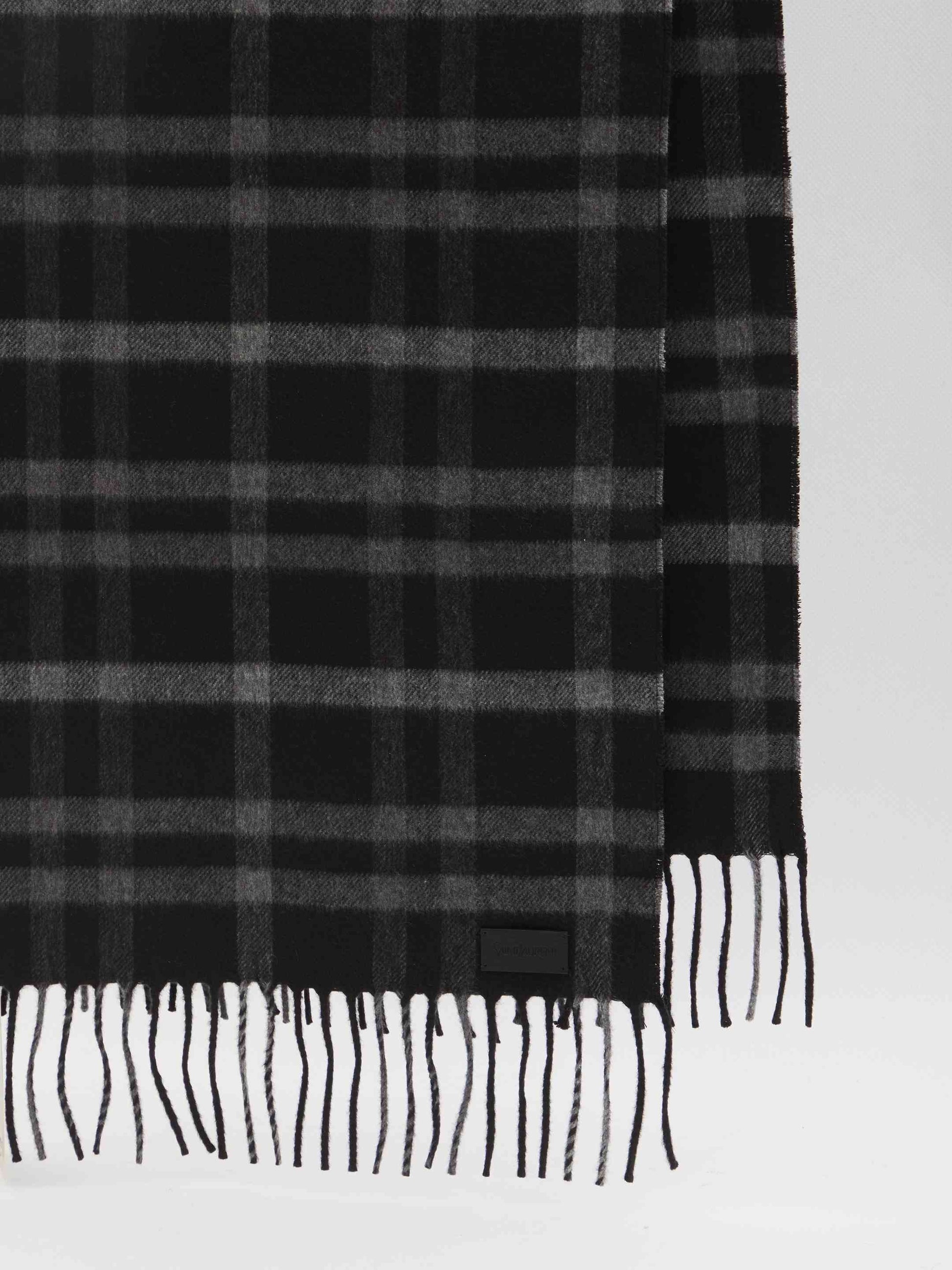 Jacquard scarf in silk and cashmere. Features black and gray tartan pattern, fringed edges, leather patch with logo.