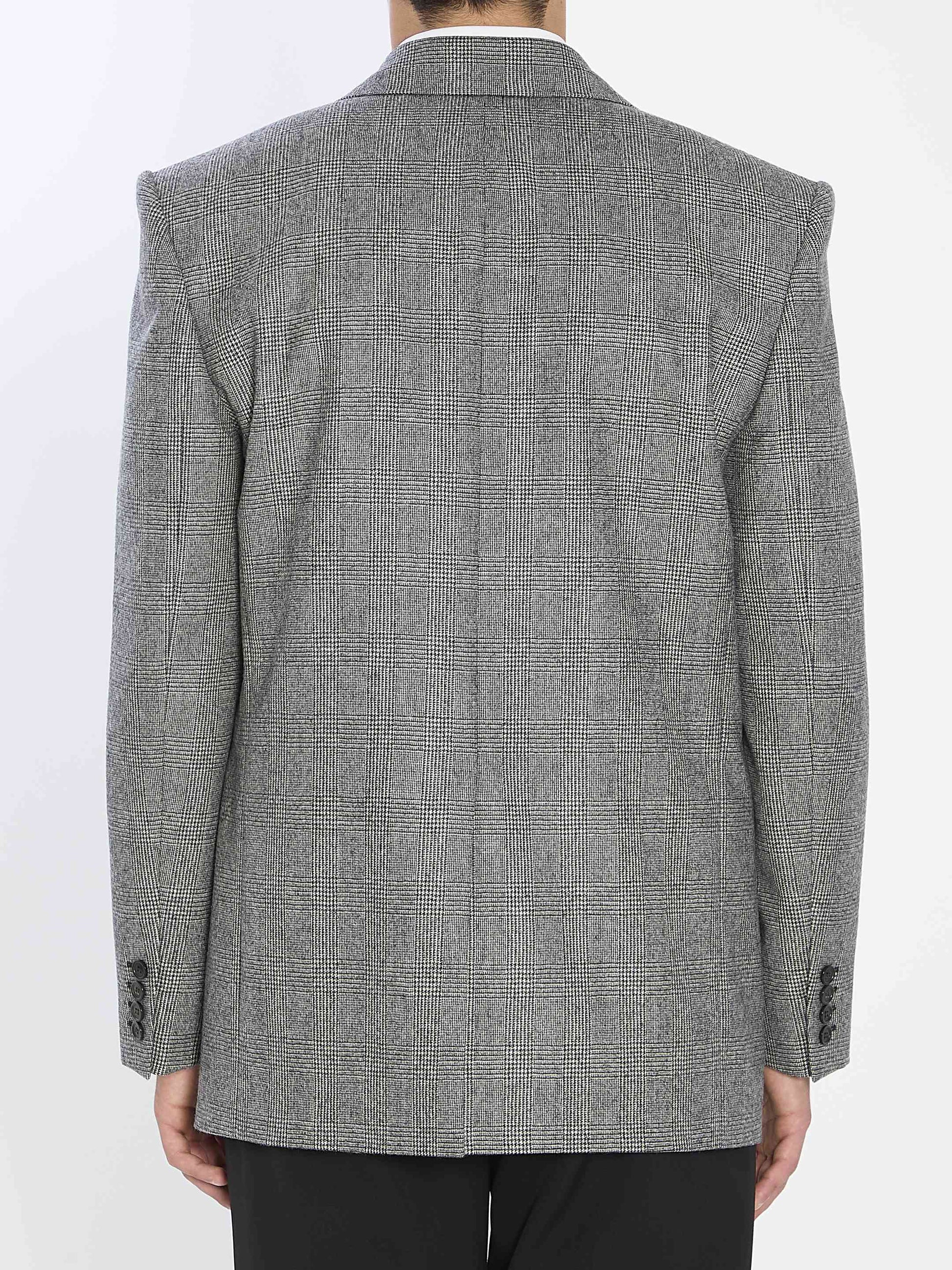 Single-breasted wool flannel jacket with black and white Prince of Wales pattern. Features notch lapels, one-button closure, two welt pockets with flaps on the front, a piped chest pocket, buttons on the cuffs, and a vent at the back. Relaxed elongated fit.