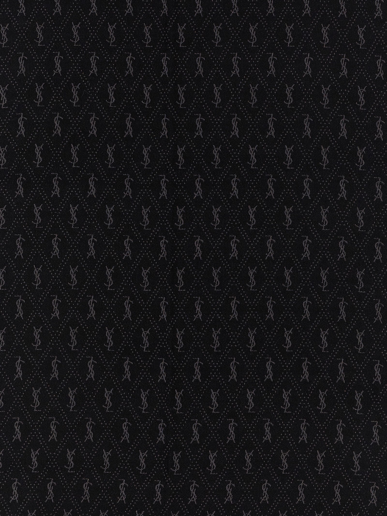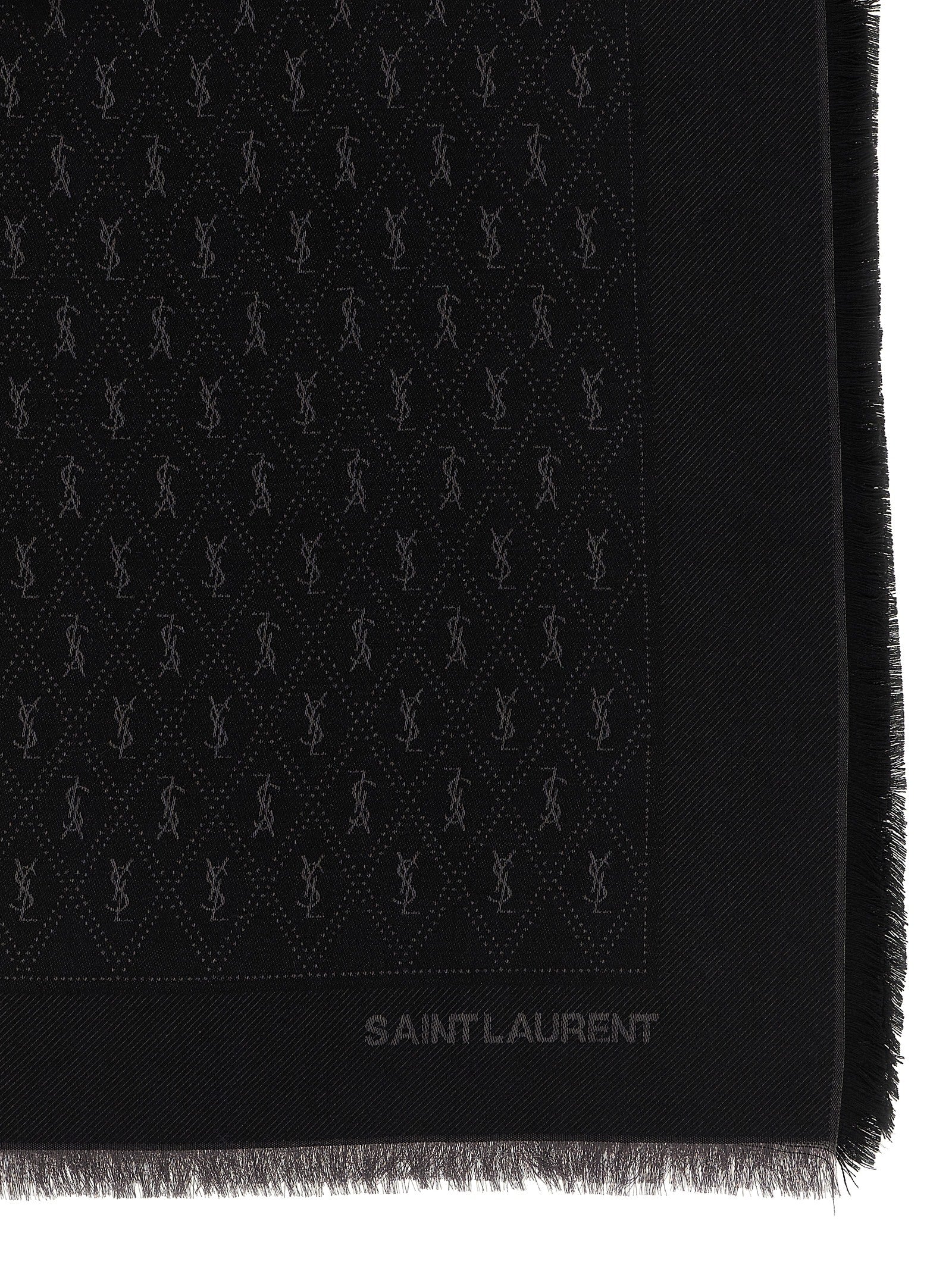 All over jacqaurd YSL monogram wool, cotton and silk blend double-sided scarf, fringed edges.