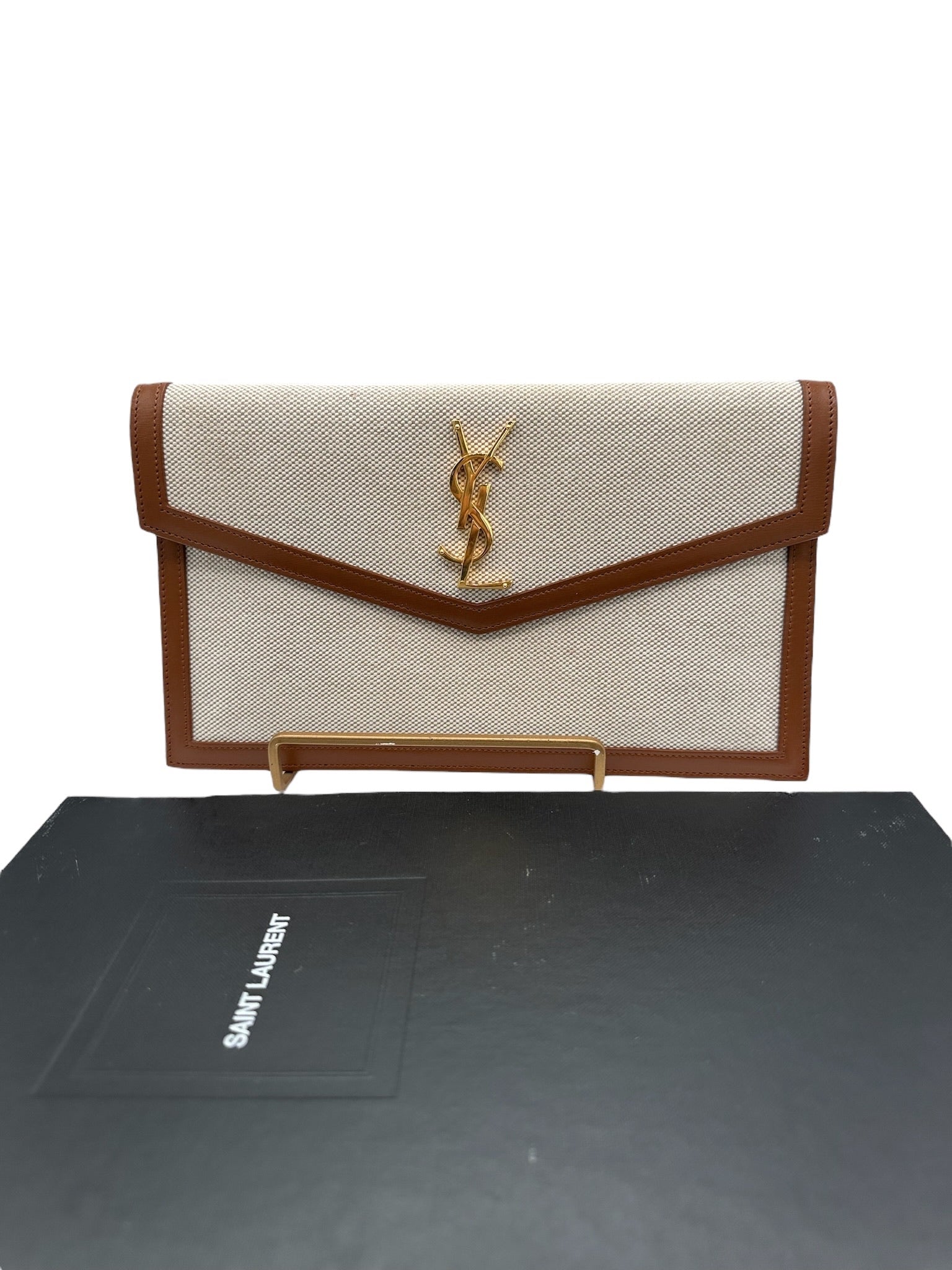This SAINT LAURENT Uptown Pouch in natural beige canvas is a chic small leather goods piece perfect for everyday use.