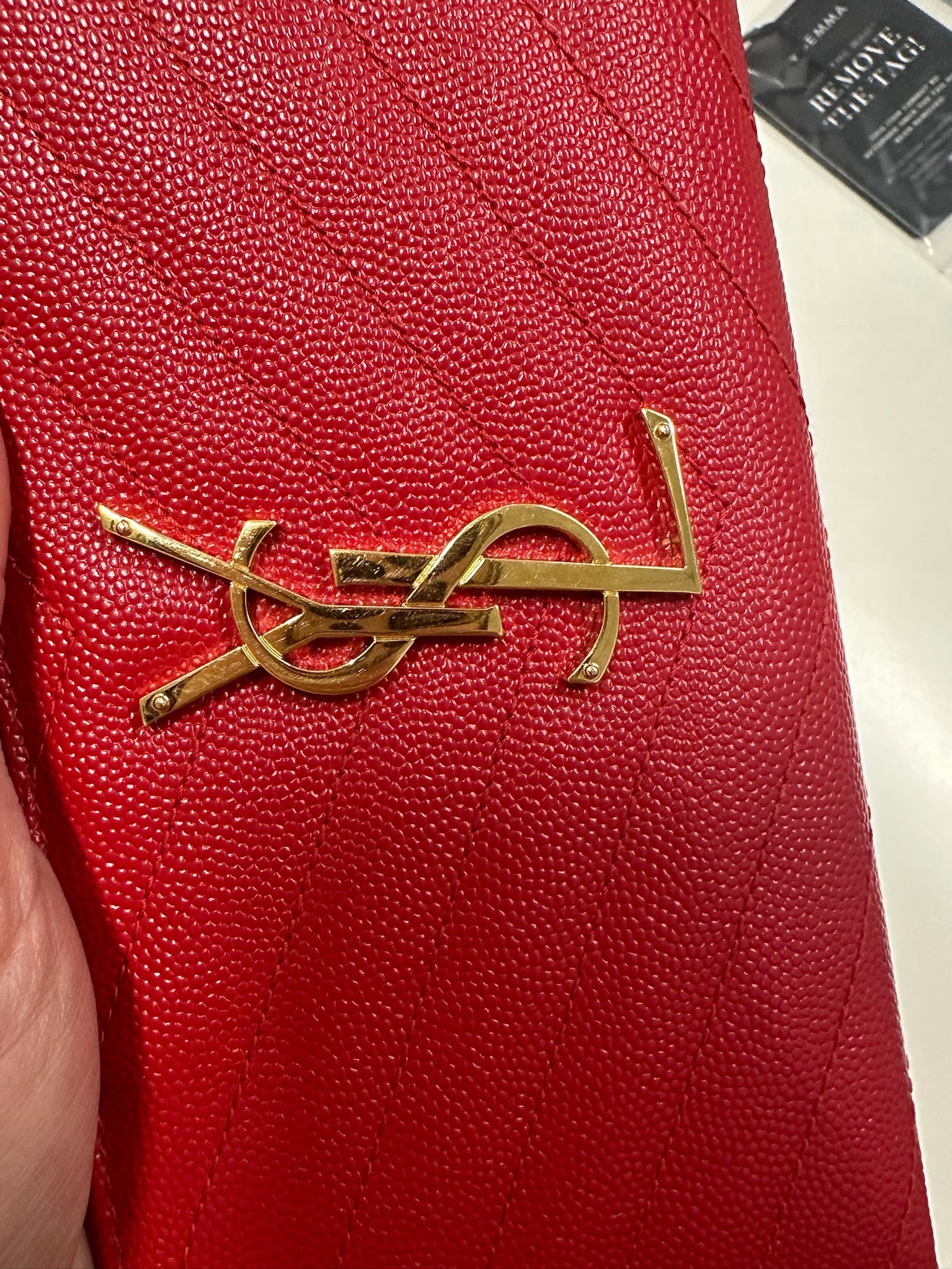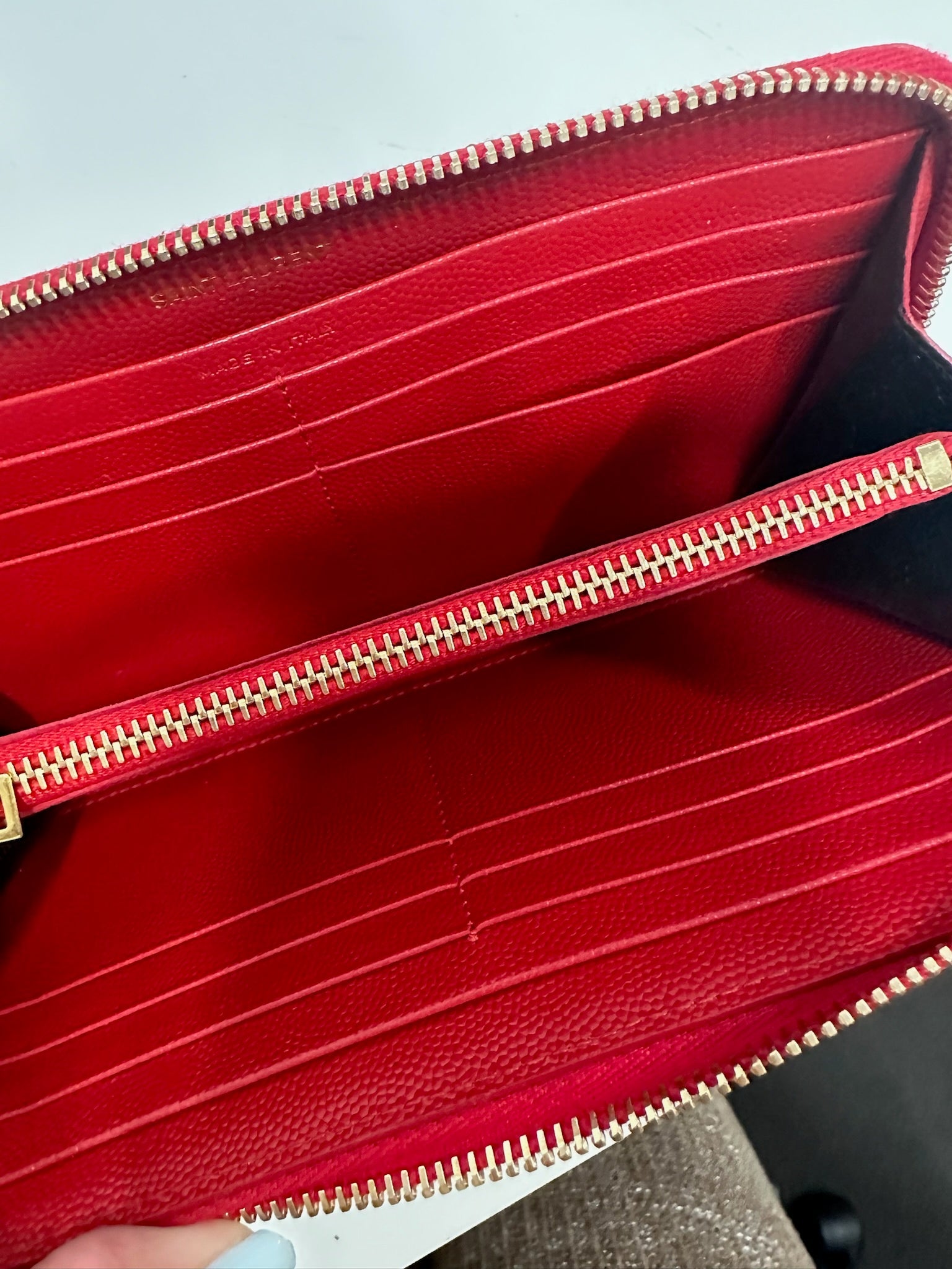 Elevate your style with the SAINT LAURENT Red Wallet. The Grain De Poudre Matelasse Monogram design features luxurious golden toned hardware, adding a touch of sophistication to this functional zip around wallet. Keep your essentials organized and make a statement with every use.
