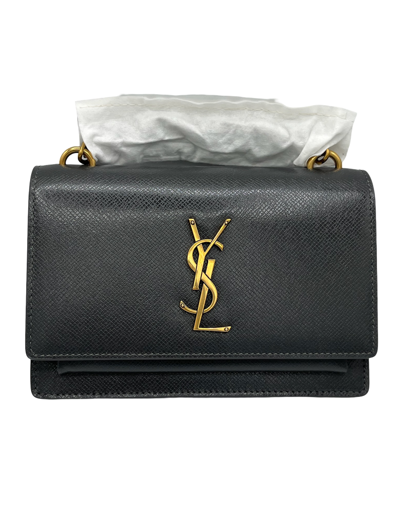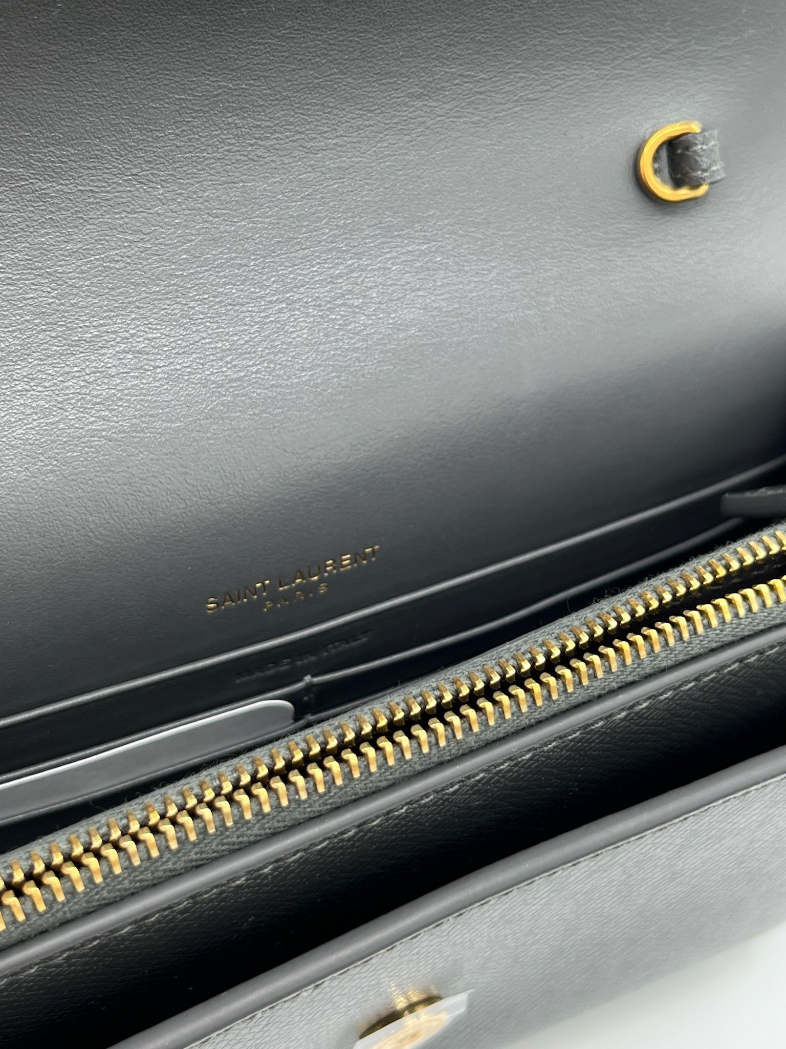 This SAINT LAURENT Sunset Chain Wallet in Coated Bark Leather is the perfect accessory for any fashion-forward individual looking for a sleek and sophisticated crossbody bag.