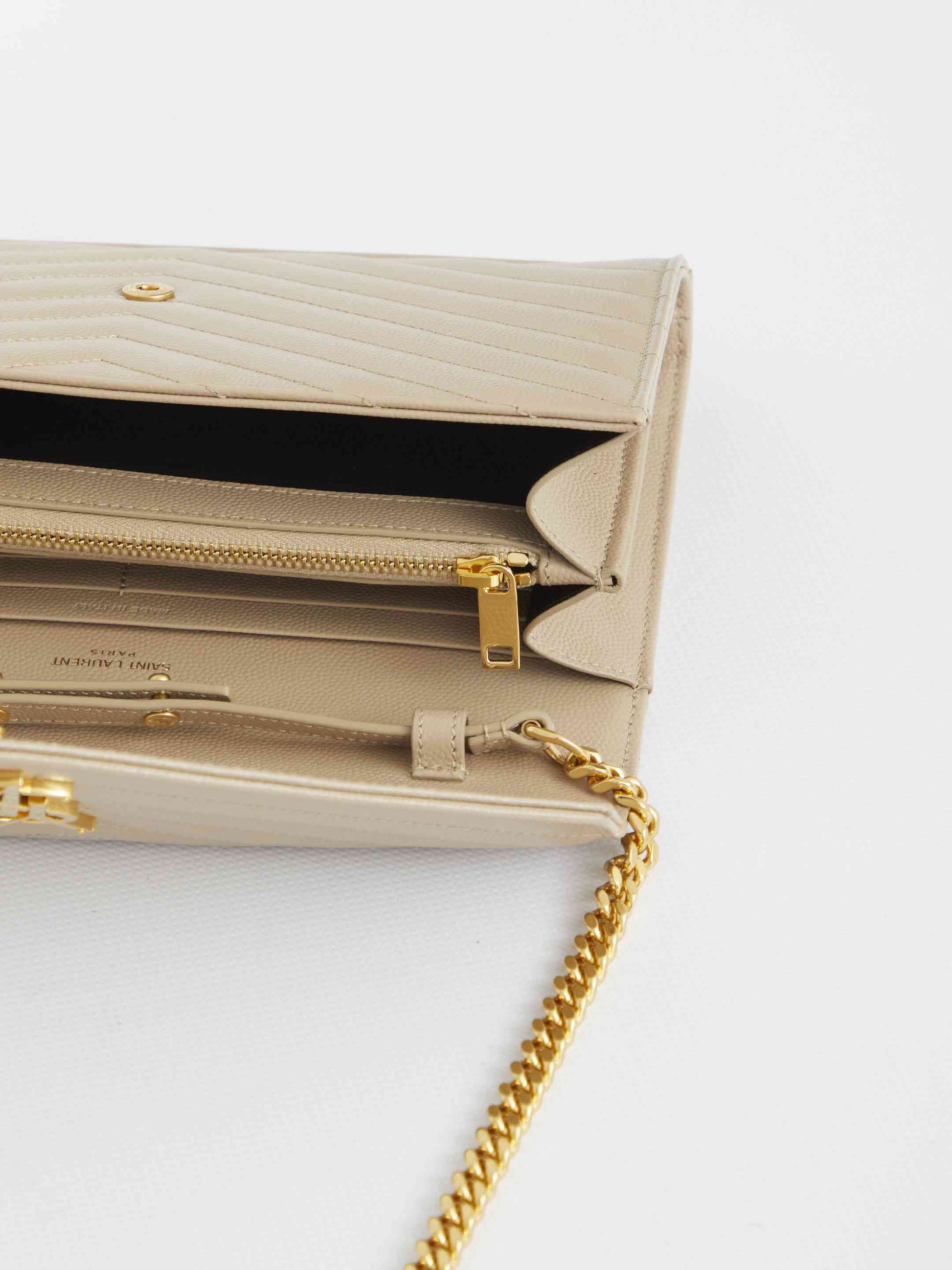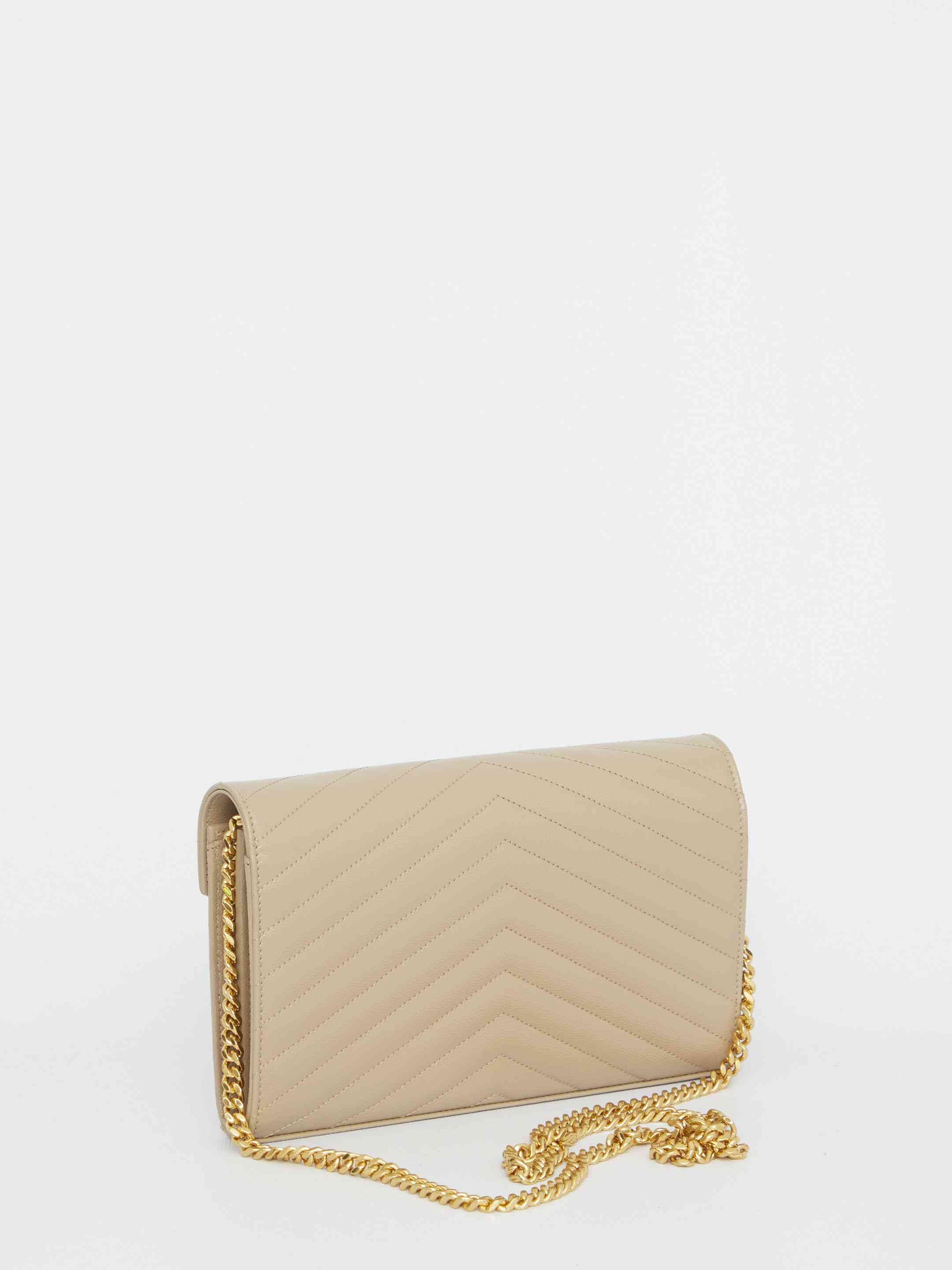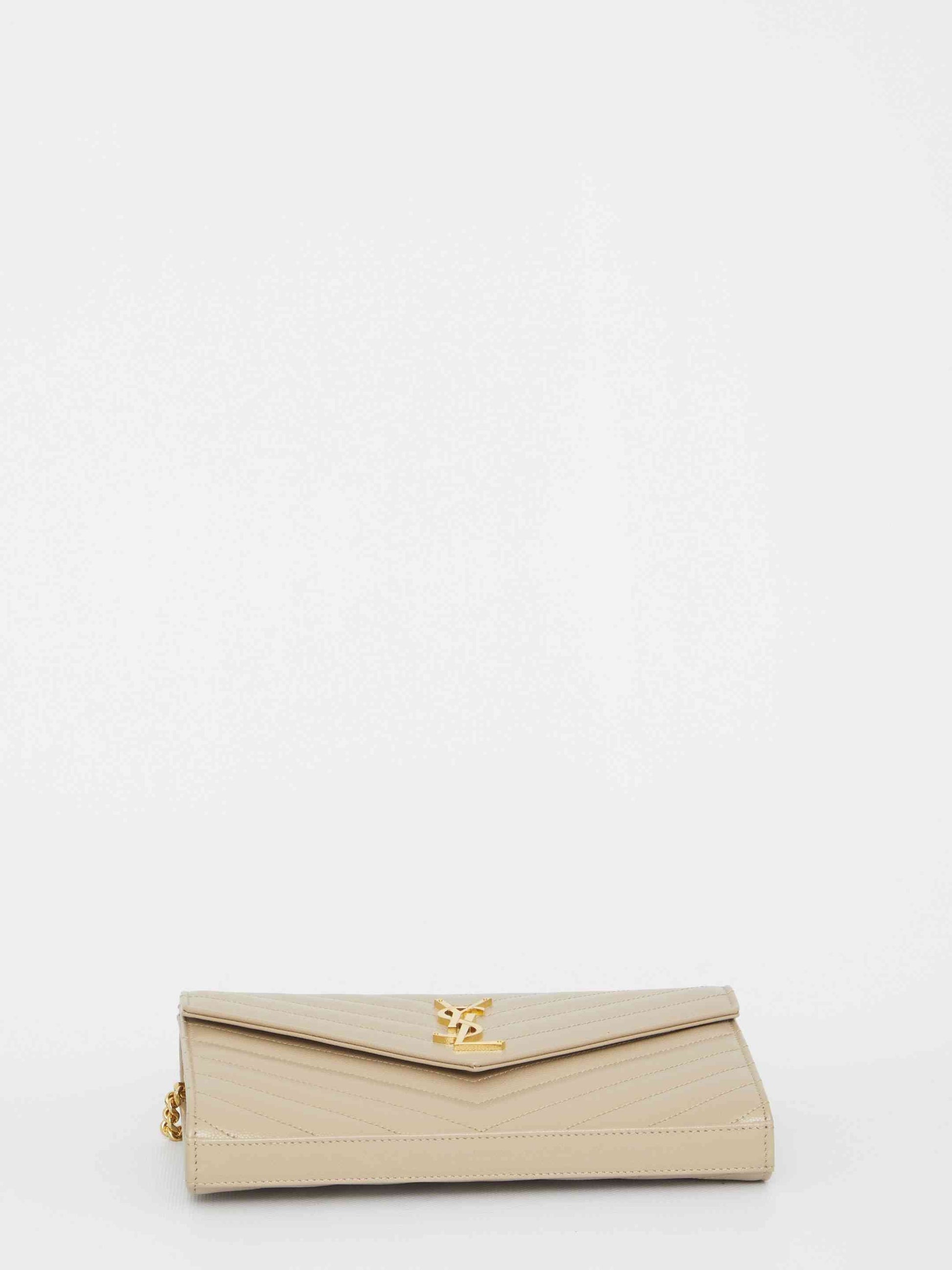 Cassandre pouch in beige matelassé calfskin with gold-tone metal YSL monogram on the front. It features front flap with snap-button closure, adjustable and detachable chain shoulder strap, two main interior compartments separated by a zip pocket, ten card slots and one flat pocket.