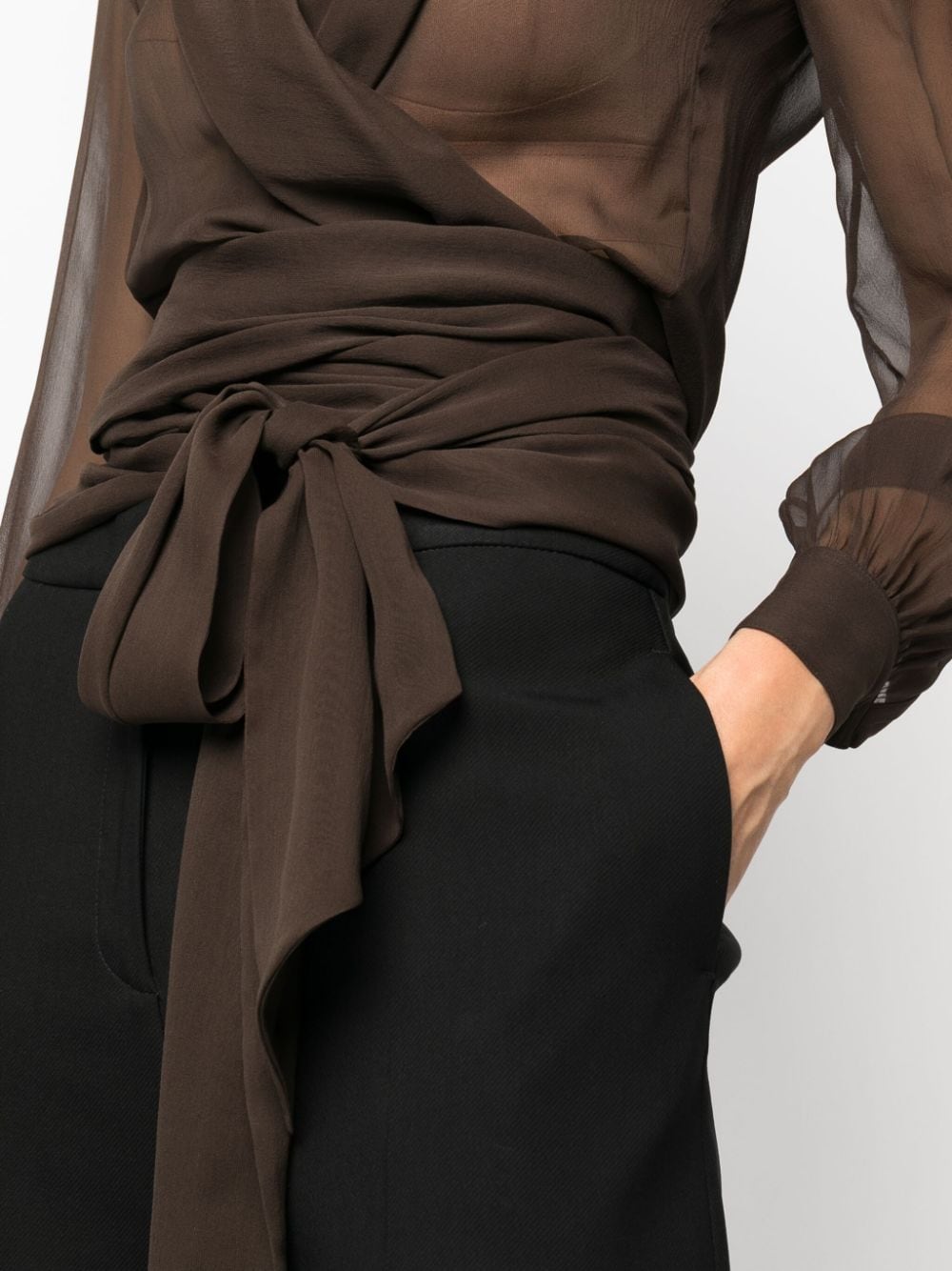 DESCRIPTION ::Silk blouse from SAINT LAURENT in brown, in organic silk, featuring a semi-sheer structure, draped design, soft hood, deep V-neck, long sleeves, buttoned cuffs, self-tie closure and straight hem.