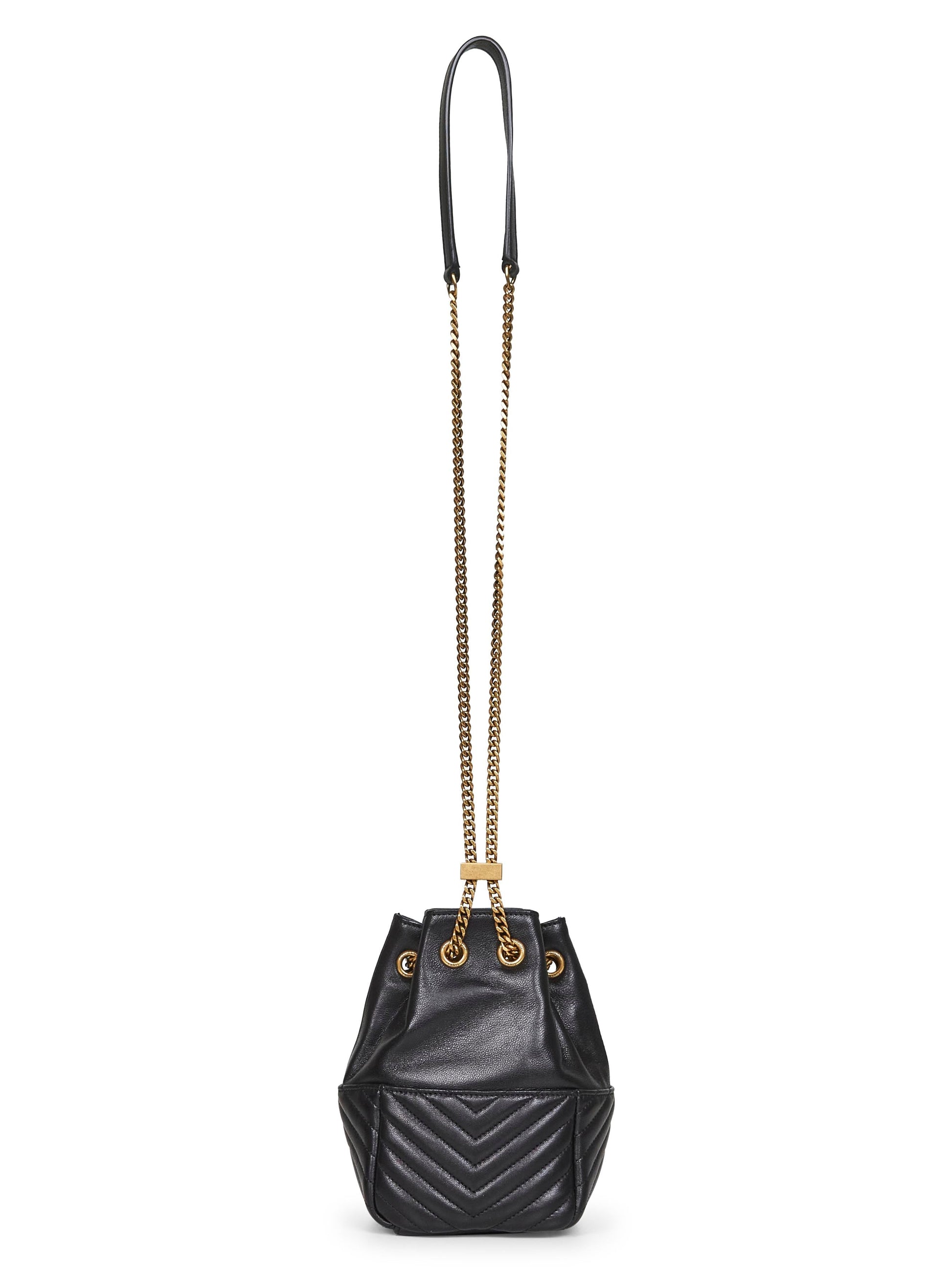 •Saint Laurent Mini Joe bucket bag in black nappa leather •Black leather with quilted chevron stitching •Chain shoulder strap •Magnetic snap closure •One main compartment and one front flap pocket •Grosgrain lining •Gold-tone hardware •Dimensions (cm): 13 x 19 x 11 •Made in Italy