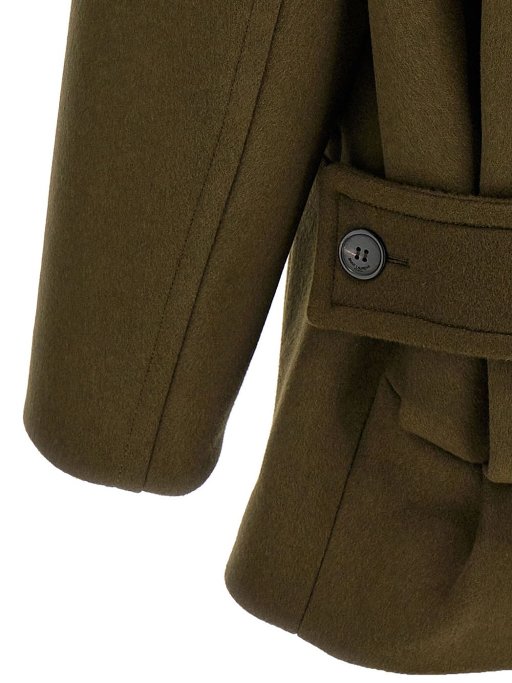 DESCRIPTION ::Single-breasted coat by SAINT LAURENT in olive green, front welt pockets, lapel collar and hidden front buttoning.