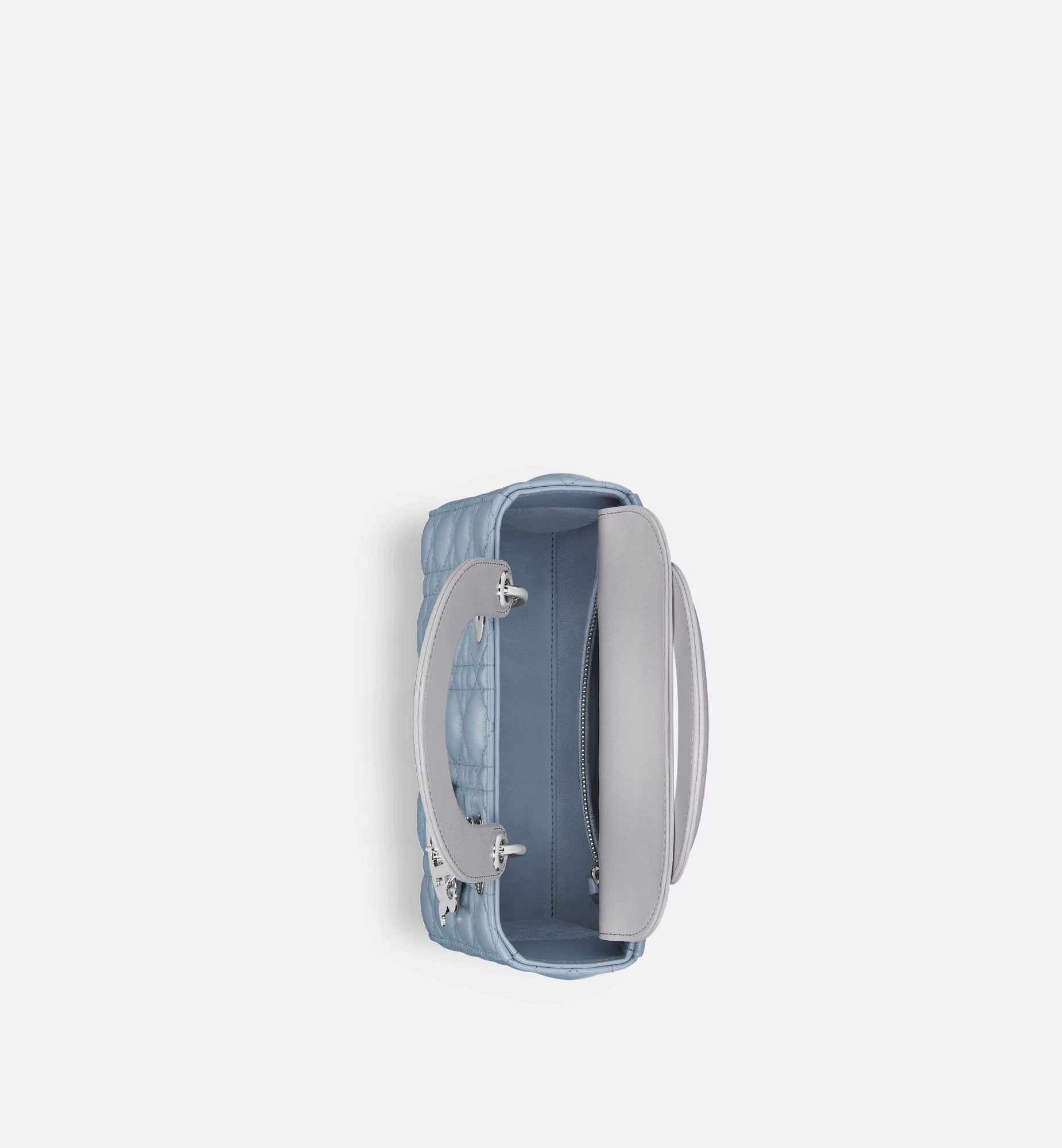 The Lady Dior bag embodies Dior's vision of elegance and beauty. Sleek and refined, the timeless yet modern style is crafted in slate blue and gray lambskin with Cannage stitching, creating the unmistakable quilted texture. The D.I.O.R. charms illuminate its silhouette and are embellished with enamel in a shade that matches the top handles. Featuring a thin, removable leather shoulder strap, the small Lady Dior bag can be carried by hand or worn crossbody.