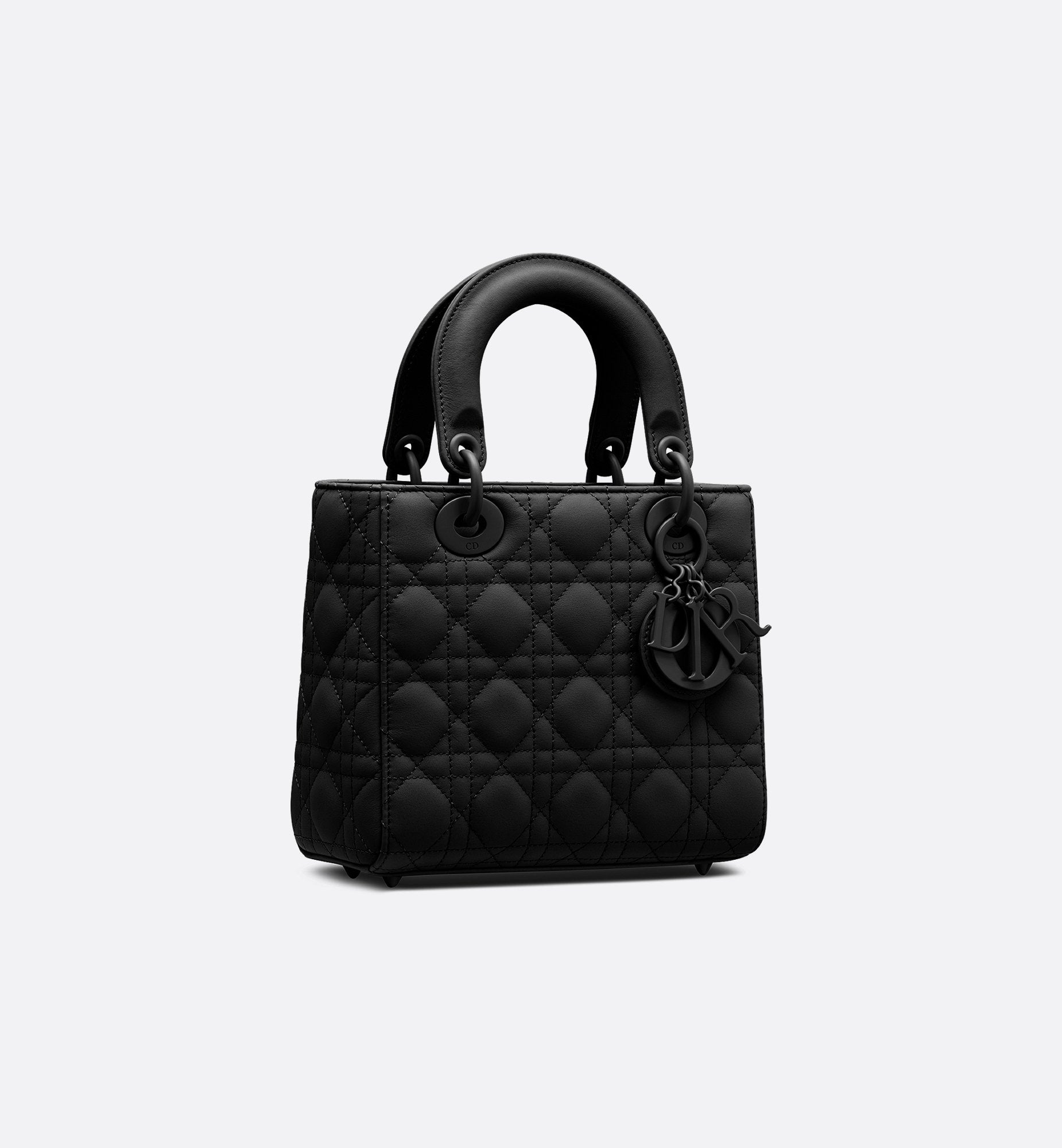The Lady Dior My ABCDior bag epitomizes Dior's vision of elegance and beauty. Sleek and refined, the timeless style is crafted in black ultramatte calfskin with Cannage stitching, creating the instantly recognizable quilted texture. Tonal metal D.I.O.R. charms further embellish its silhouette with an elegant allure. Featuring a shoulder strap that can be personalized with badges, the small, unique design may be carried by hand or worn crossbody.