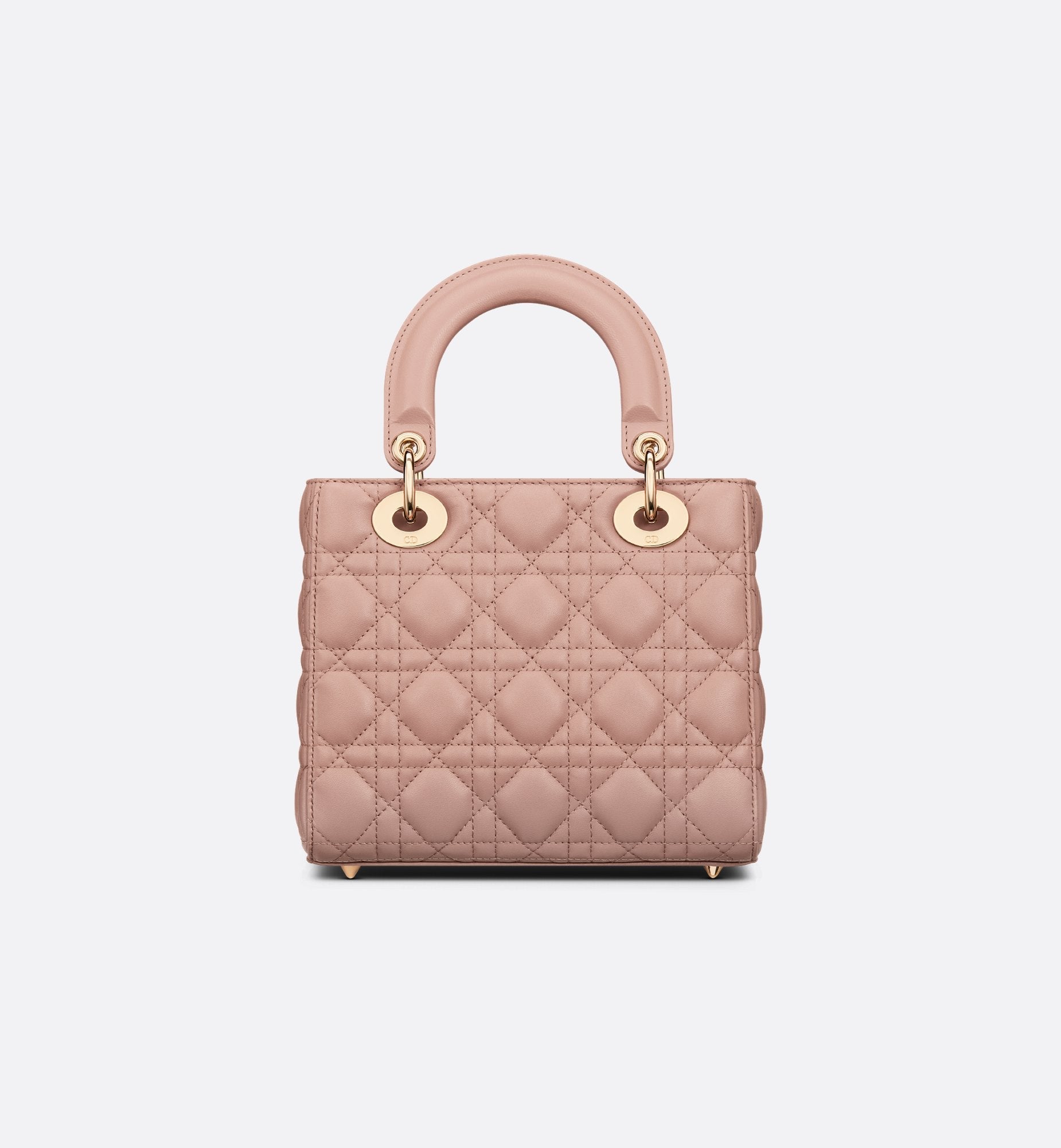 The Lady Dior My ABCDior bag epitomizes Dior's vision of elegance and beauty. Sleek and refined, the timeless style is crafted in blush lambskin with Cannage stitching, creating the instantly recognizable quilted texture. Pale gold-finish metal D.I.O.R. charms further embellish its silhouette with an elegant touch. Featuring a shoulder strap that can be personalized with badges, the small, unique design may be carried by hand or worn crossbody.