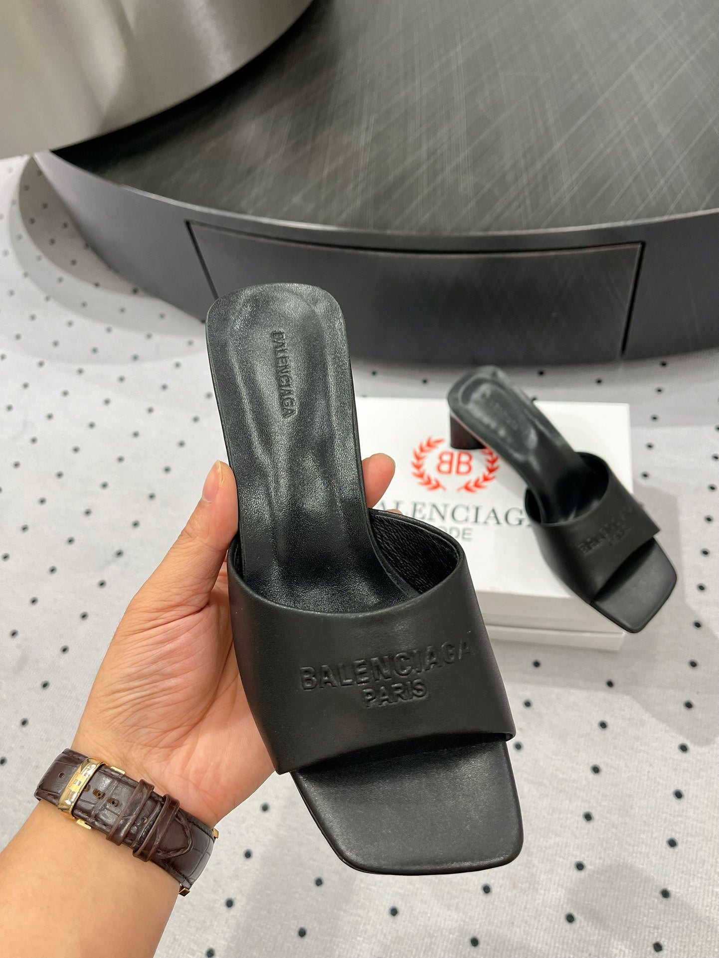 Balanciaga SQUARE-TOE MULES MEDIUM HEEL IN BLACK CALFSKIN LOGO EMBOSSED