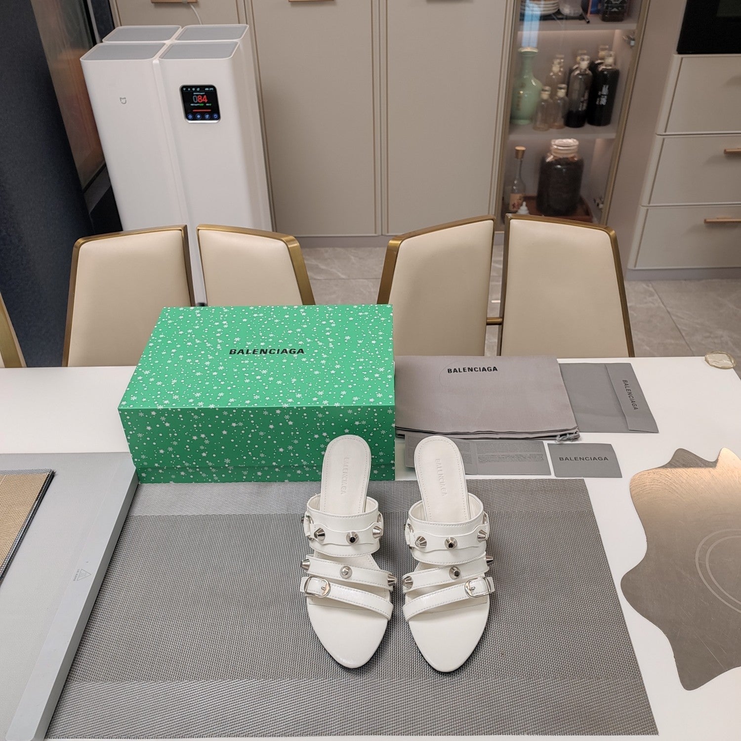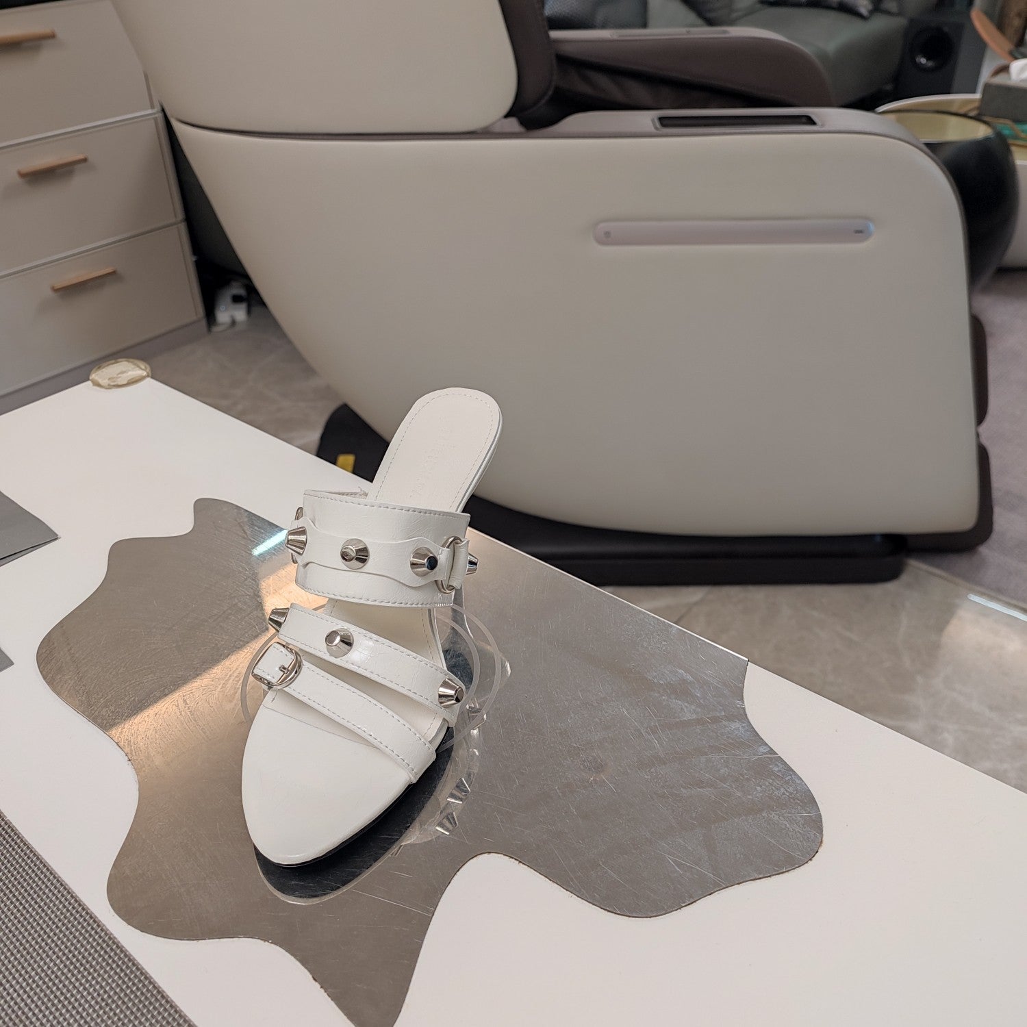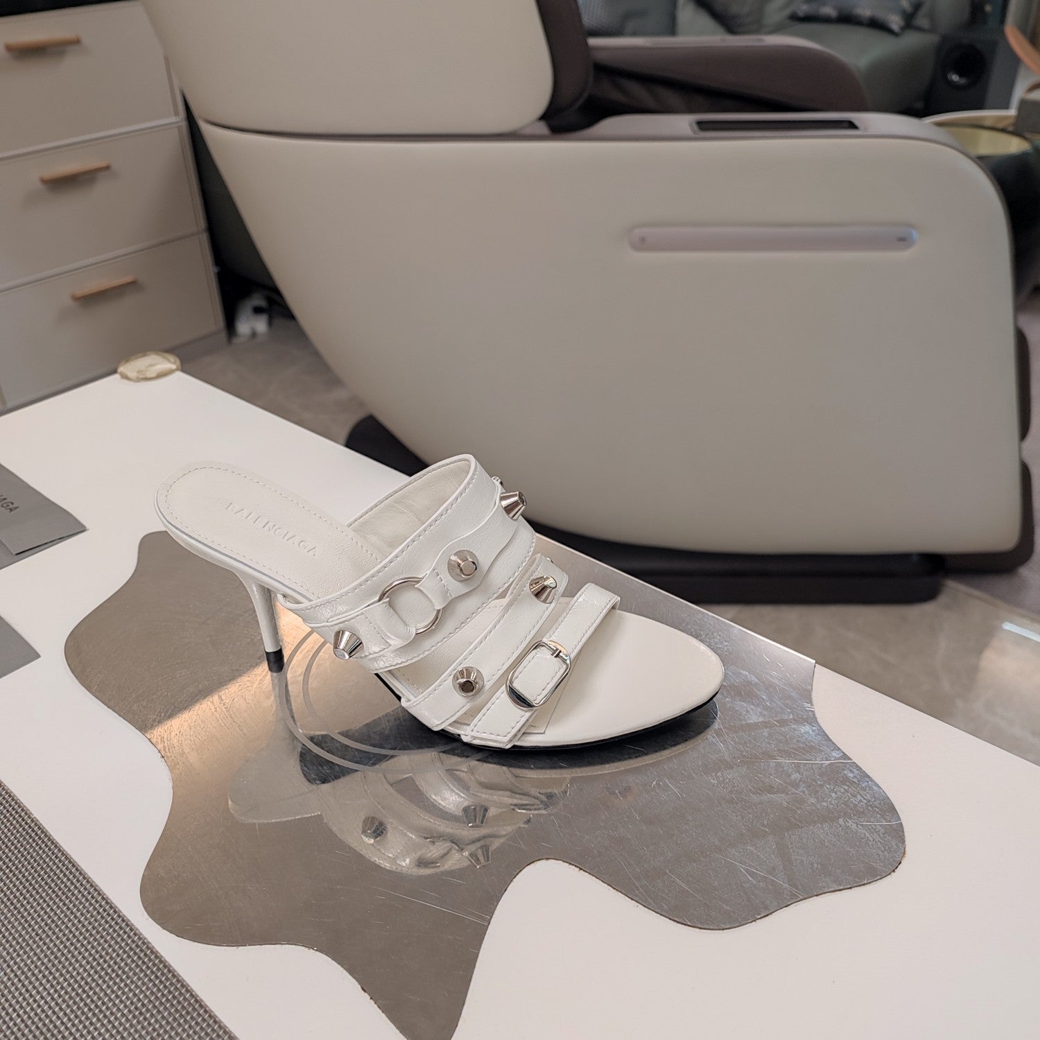 Balanciaga STRAPPY HIGH-HEELED SANDALS IN WHITE STUDDED WAX-OIL SHEEPSKIN