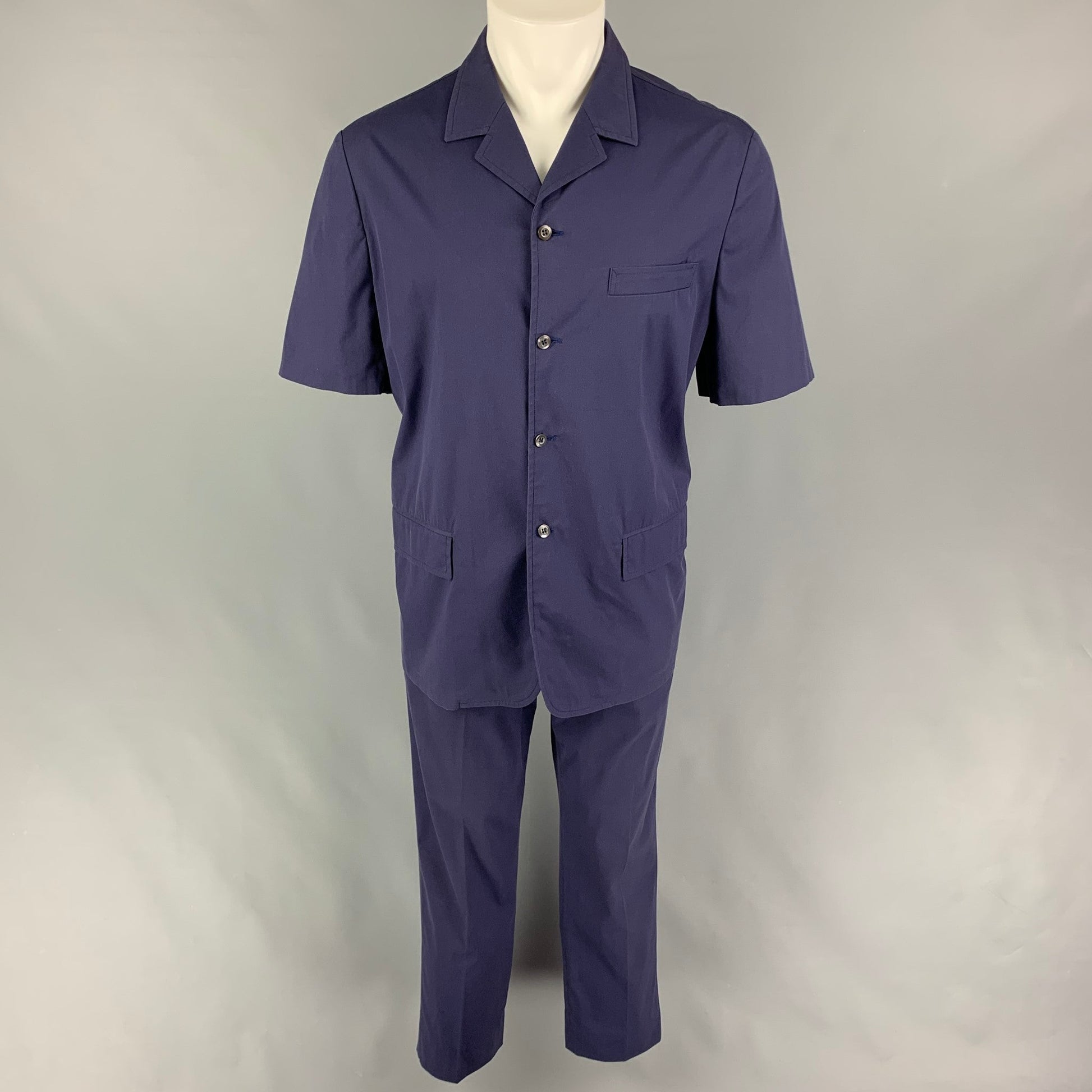 Vintage PRADA 2 Piece set comes in a navy cotton featuring a camp collar, flap pocket, short sleeves, loose fit buttoned shirt, and matching flat front trousers. Made in Italy.