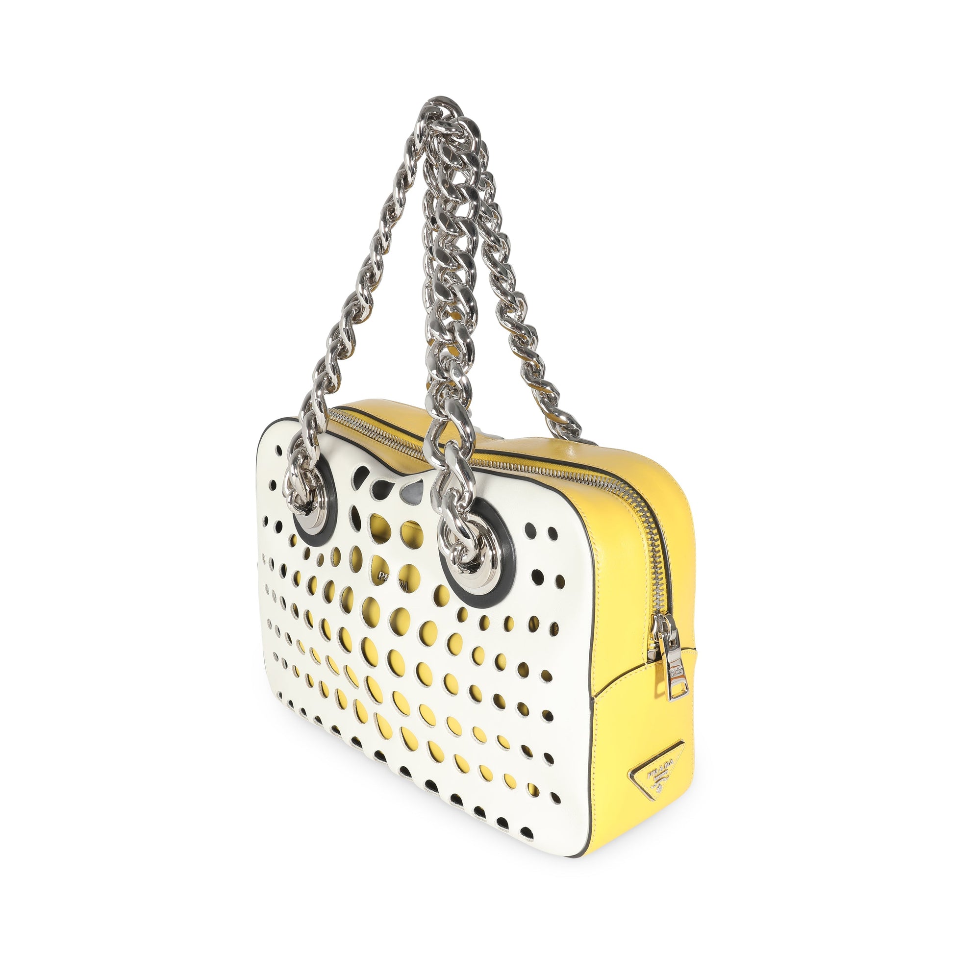 Passionately believe in the value of PRADA - White Yellow Calfskin City Fori Chain Bag. This Italian-made bag features exquisite calfskin in white and yellow, with a dustbag included. Measuring 11.5 x 9 x 5, this excellent condition bag is perfect for any outing with its 7-inch handle drop. Add this leather beauty to your collection and feel inspired every time you carry it.