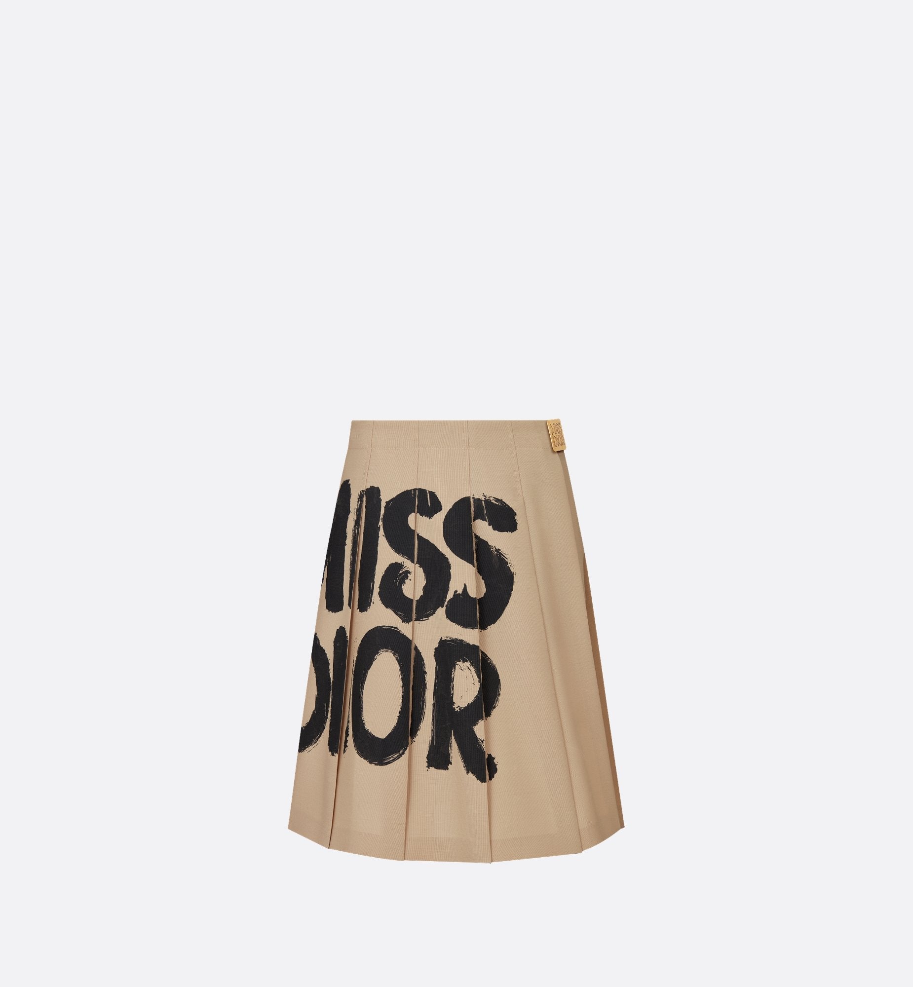 Unveiled at the Autumn-Winter 2024-2025 Fashion Show, the skirt features the black Miss Dior Graffiti motif, a nod to the 1967 debut ready-to-wear collection and a manifesto to Maria Grazia Chiuri's signature celebration of feminism. Crafted in beige virgin wool and mohair, it is distinguished by pleats and a knee-length silhouette layered over tonal shorts with a side pocket. Adorned with a gold-finish Miss Dior buckle, the flared skirt can be paired with the matching jacket to complete the look.